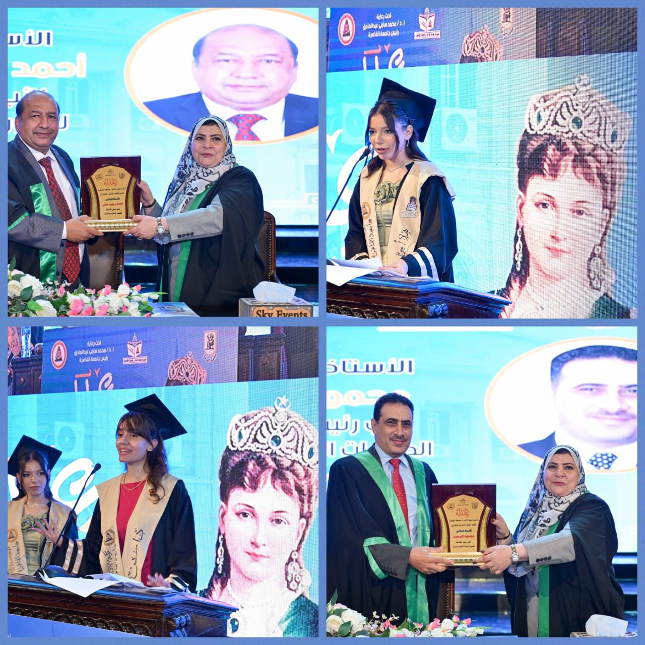 ومن جهتها، هنأت الدكتورة نجلاء رأفت عميد كلية الآداب جامعة القاهرة، الخريجين على إنجازاتهم ونجاحهم في تجاوز التحديات التي واجهتهم خلال فترة دراستهم، متمنيًة لهم مستقبًلا ناجحًا، مؤكدًة أهمية القيم الإنسانية والتربوية التي اكتسبوها في الكلية بإعتبارهم مستقبل الوطن، موجهًة الشكر للدكتور محمد سامي عبدالصادق لدعمة الدائم لكلية الآداب، وموجهًة الشكر لأولياء أمور الخريجين لما قدموه من تضحيات حتى أنهي أبناؤهم دراستهم الجامعية.