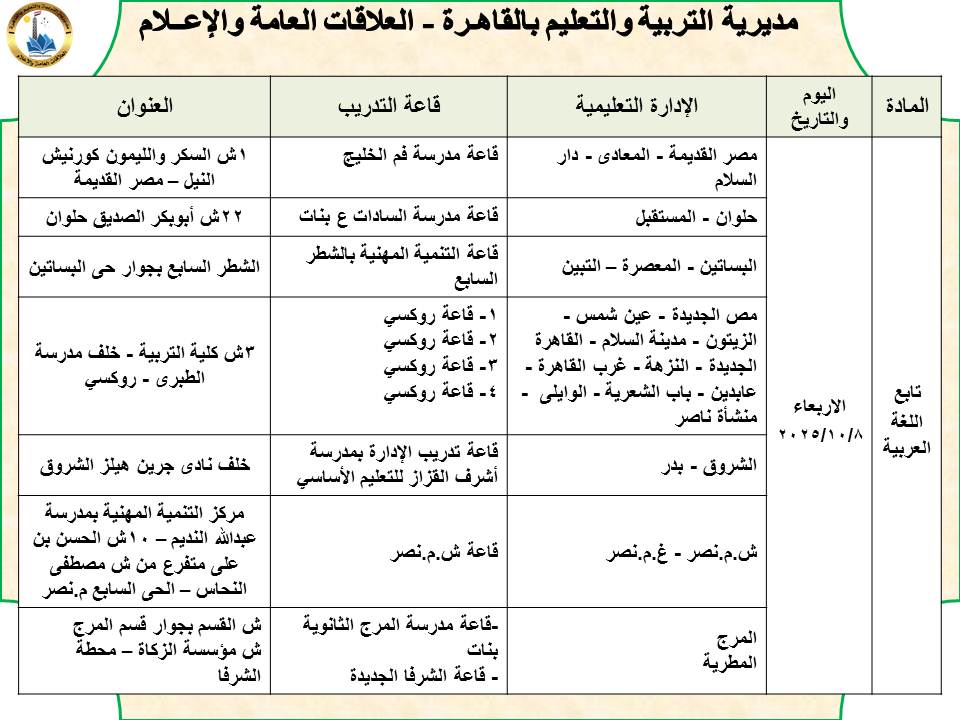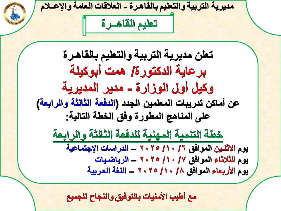 أعلنت مديرية التربية والتعليم بالقاهرة برعاية الدكتورة/ همت إسماعيل أبوكيلة، عن أماكن تدريب المعلمين الجدد للدفعتين (الثالثة _ الرابعة) على المناهج المطورة وفق الخطة التالية: