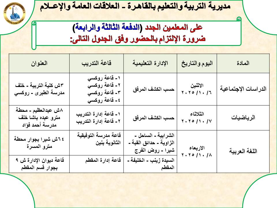 ووجهت مديرية التربية والتعليم بمحافظة القاهرة، المعلمين الجدد الدفعتين (الثالثة _ الرابعة ) بضرورة الإلتزام بالحضور وفق الجداول المعلنة والتي جاءت كالآتي: