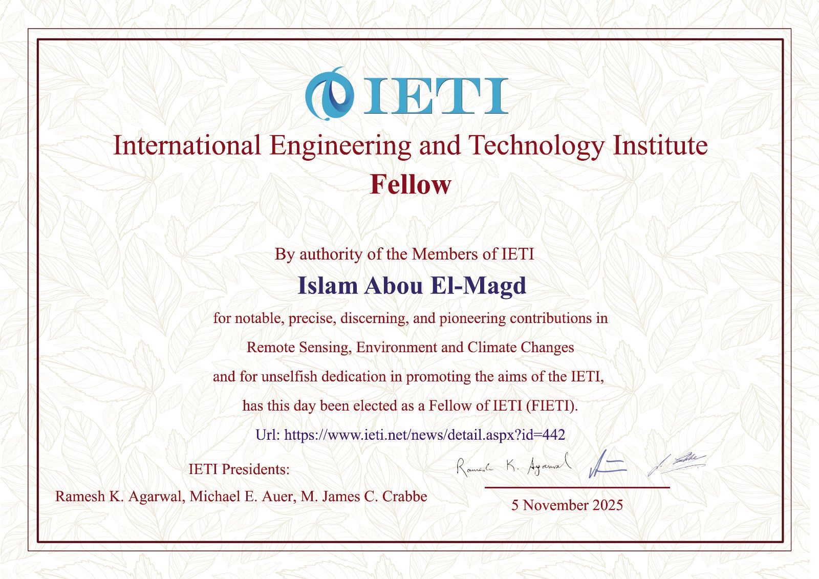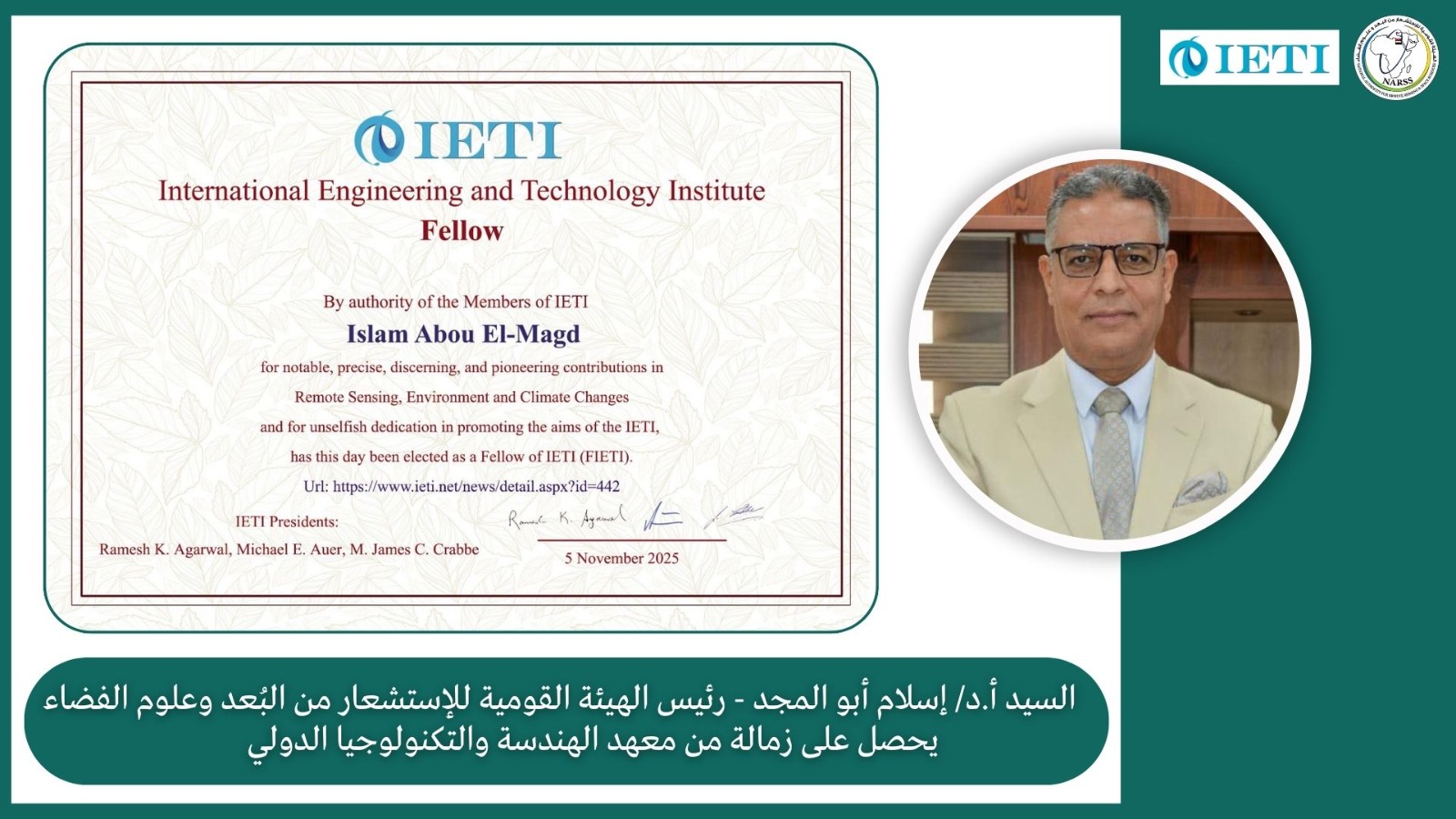 حصل الدكتور إسلام أبوالمجد رئيس الهيئة القومية للاستشعار من البعد وعلوم الفضاء، على زمالة من معهد الهندسة والتكنولوجيا الدولي، لمساهماته البارزة والدقيقة والمتميزة والرائدة في الاستشعار عن بُعد والبيئة وتغيرات المناخ، ولتفانيه في تعزيز أهداف معهد الهندسة والتكنولوجيا الدولي.
