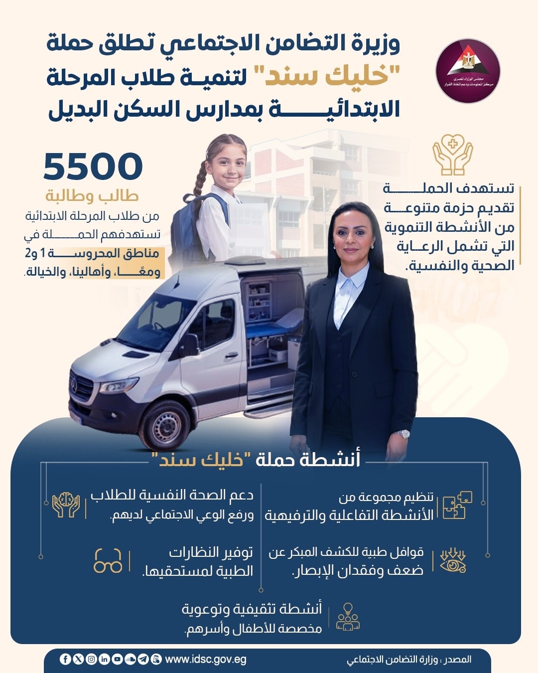 أطلقت الدكتورة مايا مرسي وزيرة التضامن الاجتماعي، حملة “خليك سند” لتنمية طلاب المرحلة الابتدائية بمدارس السكن البديل.