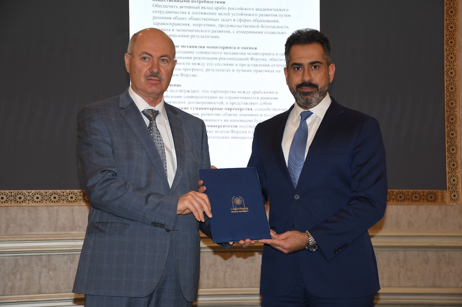 – إنشاء مركز التميز العربي–الروسي للتعليم والبحث العلمي ليكون مظلة مؤسسية للمحاور البحثية، وداعمًا للمختبرات المشتركة وبرامج الدكتوراه المزدوجة، إضافة إلى منصات افتراضية للتدريب والابتكار.