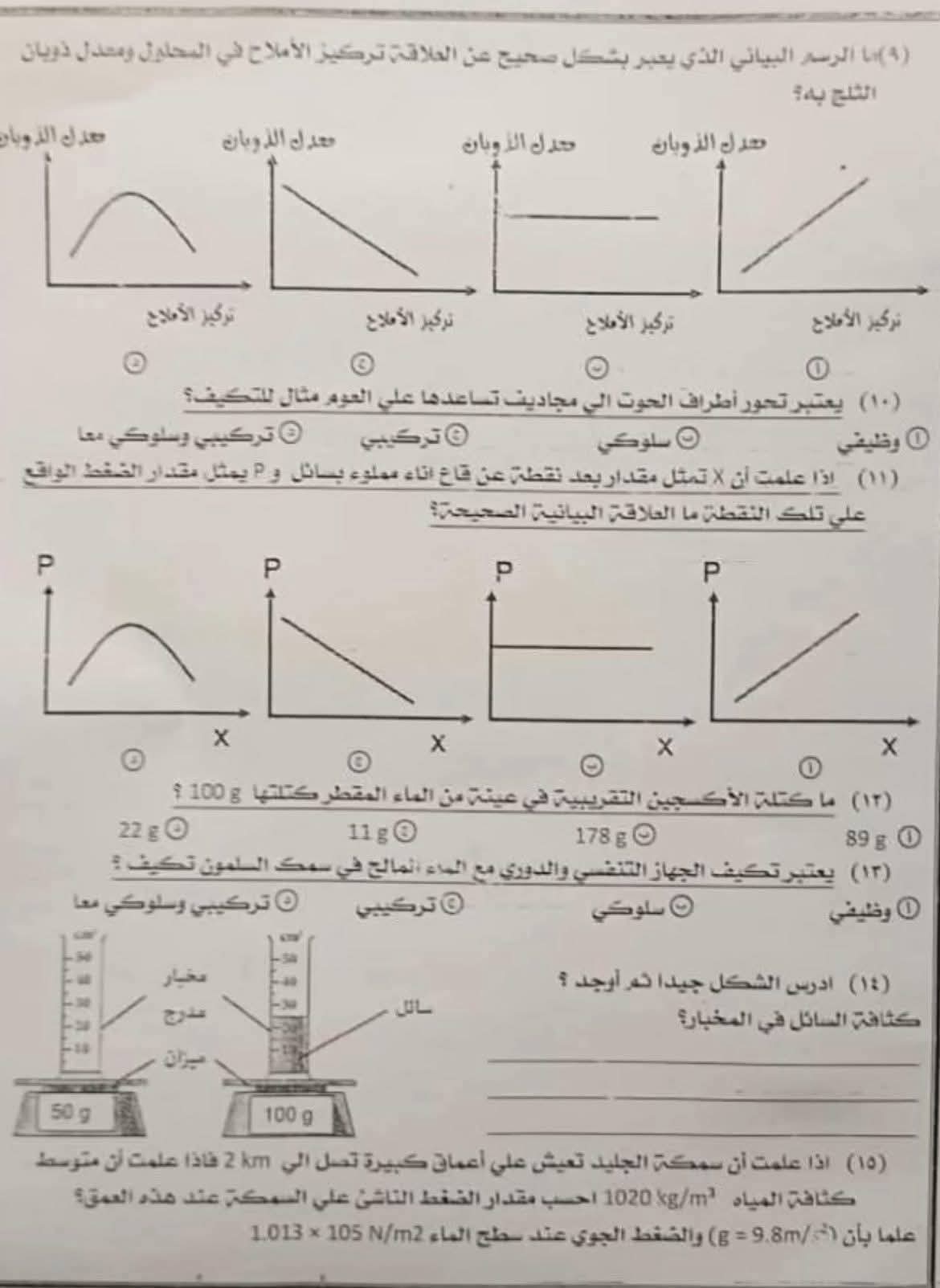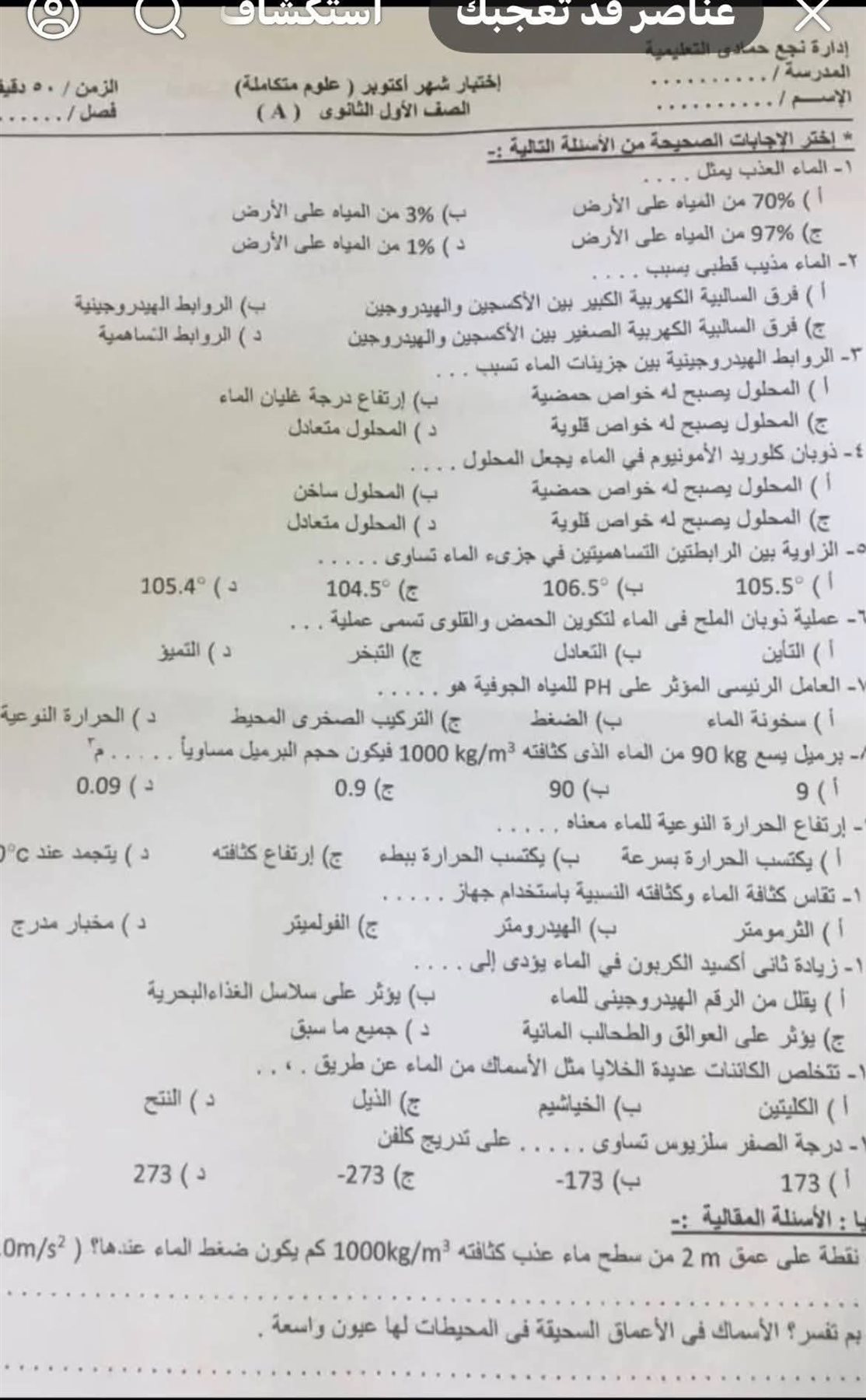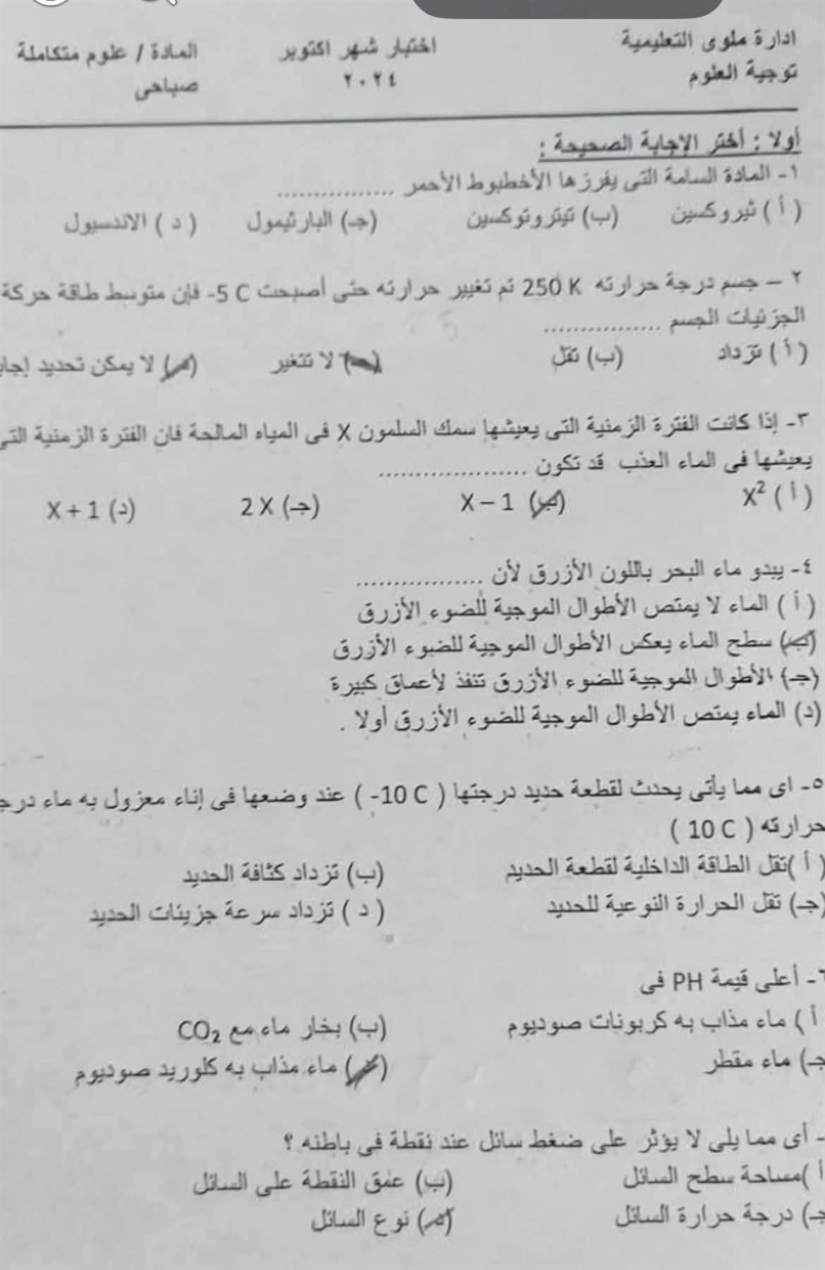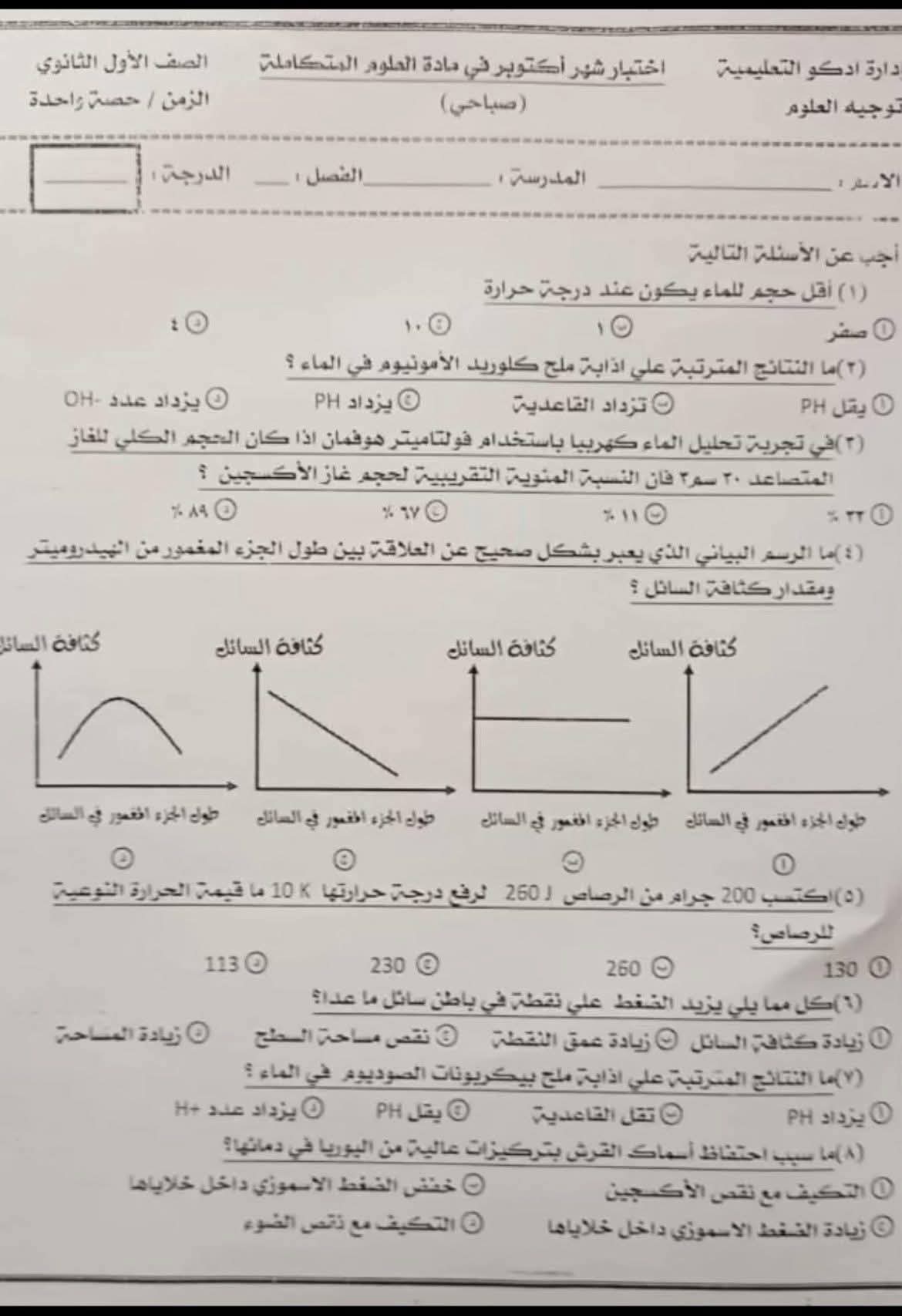 نموذج امتحان شهر أكتوبر بمادة العلوم المتكاملة لطلاب الأول الثانوي العام والبكالوريا
