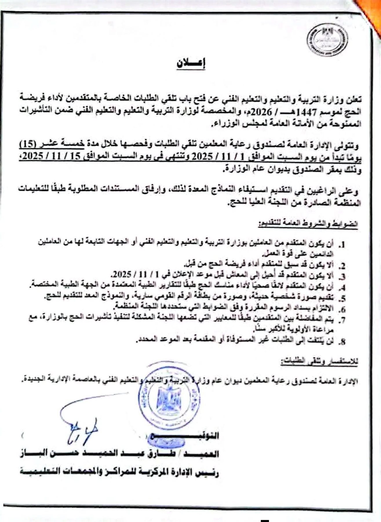 أعلنت وزارة التربية والتعليم والتعليم الفني، عن فتح باب تلقي الطلبات الخاصة بالمتقدمين لأداء فريضة الحج لموسم 1447هـ / 2026م، والمخصصة لوزارة التربية والتعليم والتعليم الفني ضمن التأشيرات الممنوحة من الأمانة العامة لمجلس الوزراء.