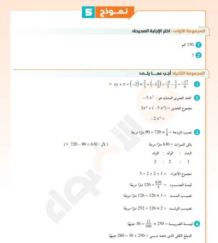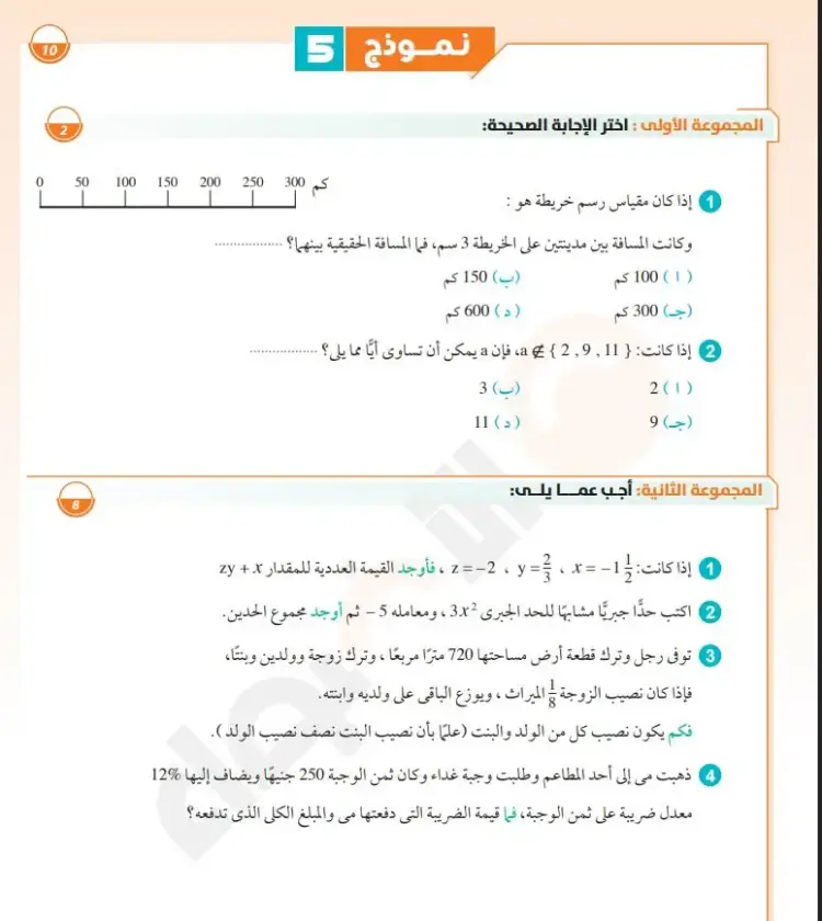 وجاء سؤال ثاني:ذهبت مى إلى أحد المطاعم وطلبت وجبة غداء وكان ثمن الوجبة 250 جنيهًا ويضاف إليها 12% معدل ضريبة على ثمن الوجبة، فما قيمة الضريبة التي دفعتها مى والمبلغ الكلي الذي تدفعه؟