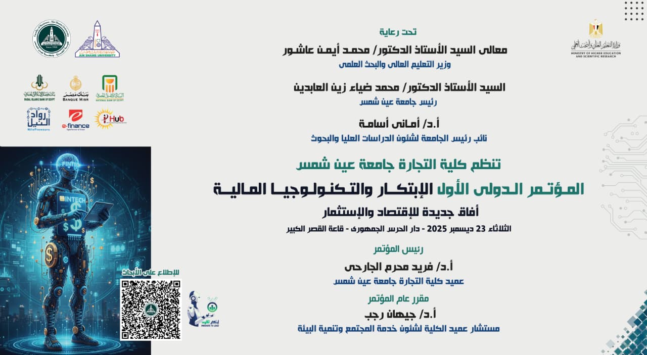 ودعا عميد كلية التجارة جامعة عين شمس، جميع الباحثين والمختصين والمهتمين في مجالات البنوك والتقنيات المالية والاستثمار للمشاركة الفعّالة، سواء من خلال تقديم الأبحاث أو حضور الفعاليات وورش العمل العلمية المتخصصة.