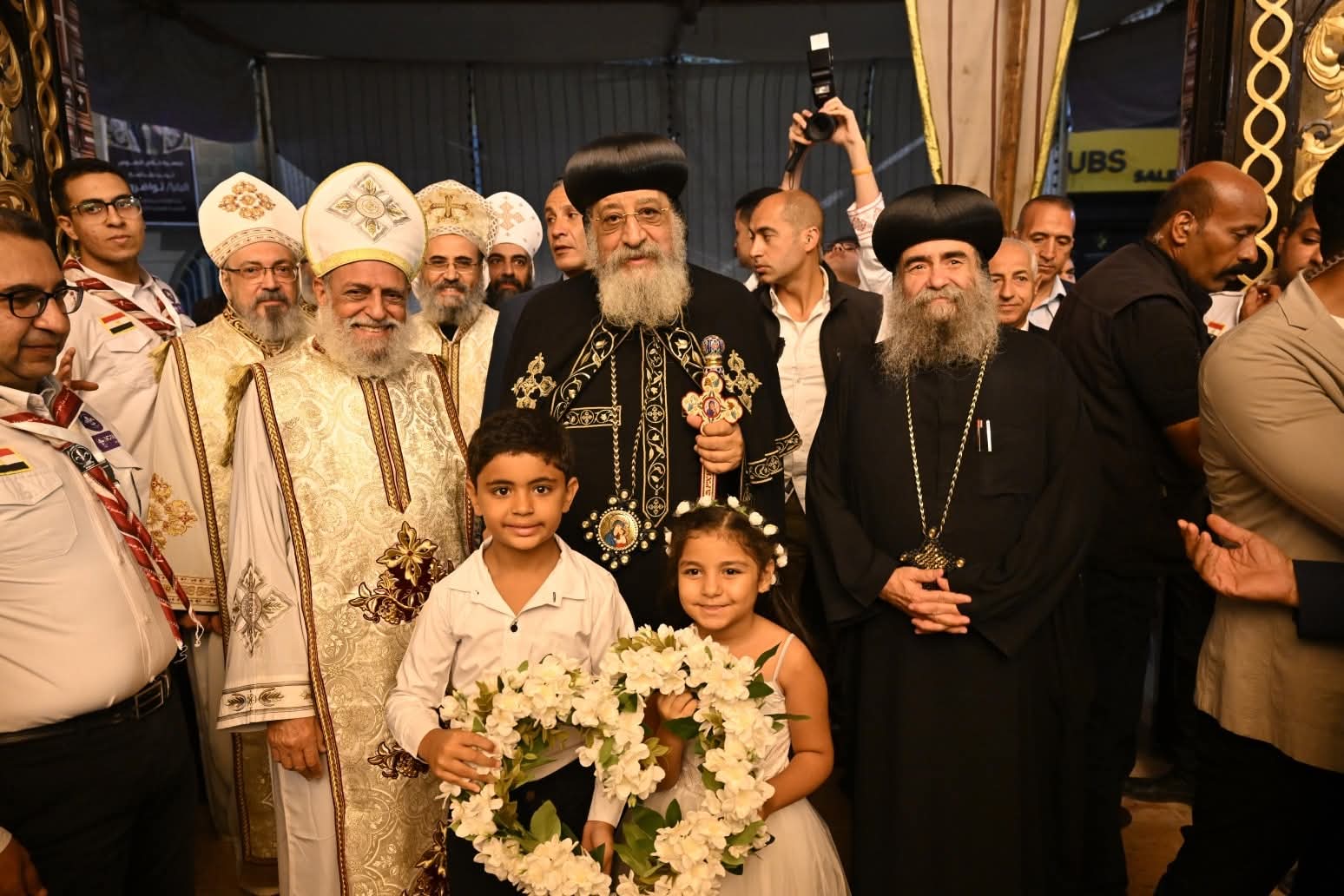 وأزاح قداسته الستار لدى وصوله الكنيسة عن اللوحة التذكارية التي تؤرخ لتدشينها، وقدم طفل وطفلة باقات الورود لقداسة البابا، قبل أن يدخل إلى الكنيسة يتقدمه خورس الشمامسة بالألحان وسط تفاعل ممزوج بالفرحة من قبل الشعب الحاضر.