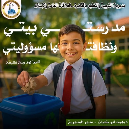 دعت مديرية التربية والتعليم بالقاهرة، جميع الطلاب، للحفاظ على نظافة مدارسهم، وعدم الكتابة على الحوائط والأبواب، والمساهمة في جعل الفصول والطرقات جميلة خالية من القمامة، وللمحافظة على البيئة المدرسية سلوك حضاري مما يعكس روح الانتماء والمسؤولية.