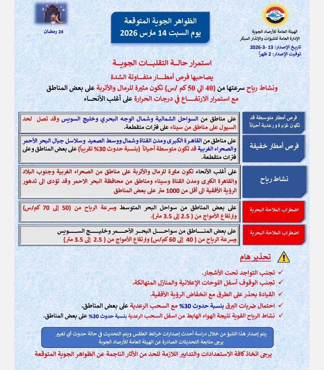أعلنت الهيئة العامة للأرصاد الجوية عن تفاصيل النشرة الجوية لحالة الطقس المتوقعة اليوم السبت الموافق 14 مارس 2026، والذي يوافق الرابع والعشرين من شهر رمضان المبارك. وتشهد كافة أنحاء الجمهورية استمراراً لحالة التقلبات الجوية العنيفة والمتباينة، والتي يصاحبها هطول أمطار متفاوتة الشدة ونشاط قوي للرياح المثيرة للرمال والأتربة.
