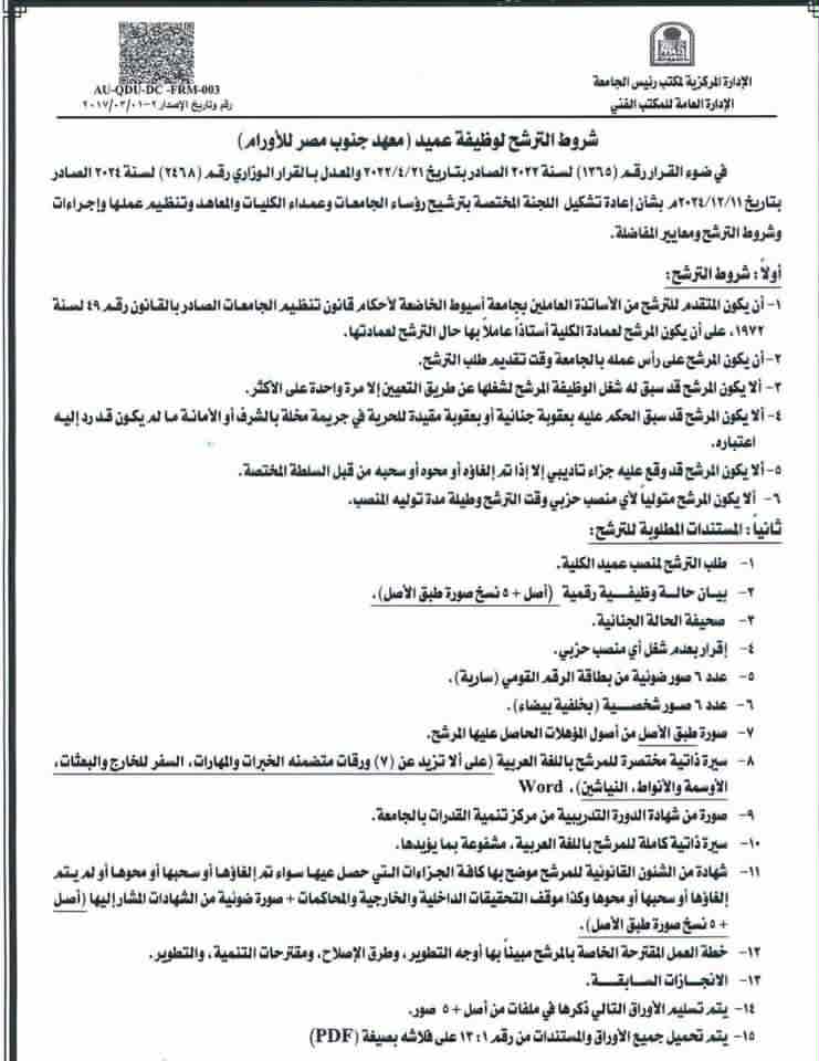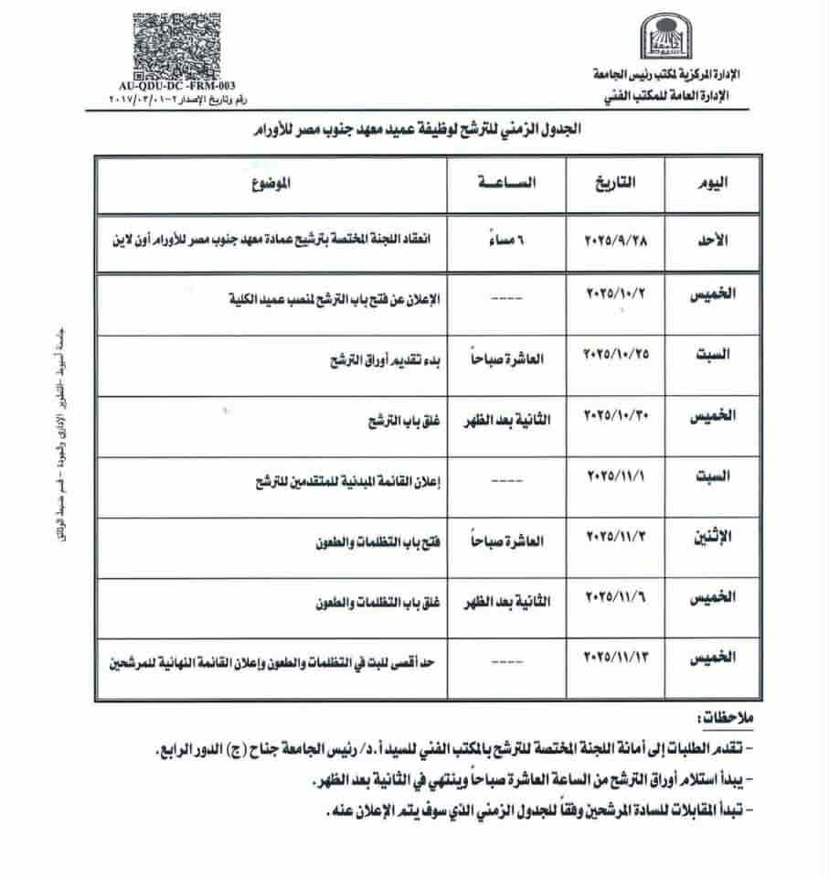 ويتم تقديم الطلبات، إلى أمانة اللجنة المختصة للترشح بالمكتب الفني لرئيس جامعة أسيوط، جناح (ج)، الدور الرابع بالمبنى الإداري، على أن تبدأ المقابلات للمرشحين وفقًا للجدول الزمني المعلن.