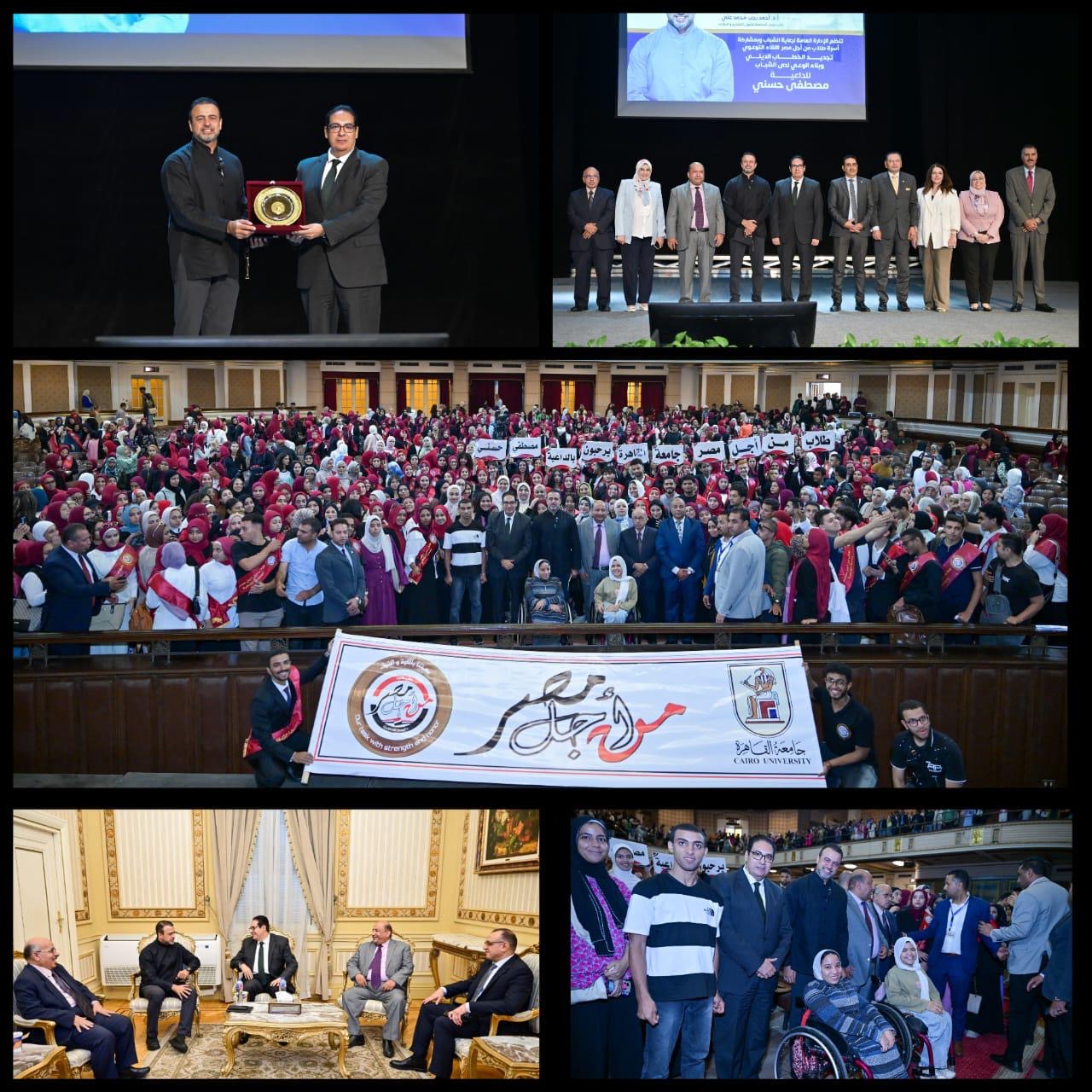 شهدت قاعة الاحتفالات الكبرى بجامعة القاهرة تحت رعاية وحضور الدكتور محمد سامي عبدالصادق رئيس الجامعة، وإشراف الدكتور أحمد رجب نائب رئيس الجامعة لشئون التعليم والطلاب، اللقاء التوعوي حول الخطاب الديني وبناء الوعي لدى الشباب، والذي حاضر خلاله الداعية مصطفى حسني، ونظمته الإدارة العامة لرعاية الشباب بجامعة القاهرة بمشاركة أسرة طلاب من أجل مصر.