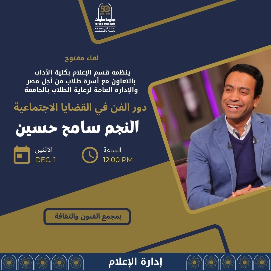 يستضيف مجمع الفنون والثقافة جامعة حلوان واحدًا من أبرز اللقاءات المفتوحة خلال العام الجامعي، وذلك في الفعالية التي ينظمها قسم الإعلام بكلية الآداب جامعة حلوان بالتعاون مع أسرة طلاب من أجل مصر المركزية، والإدارة العامة لرعاية الطلاب جامعة حلوان، تحت عنوان: دور الفن في القضايا الاجتماعية.. لقاء مفتوح مع النجم سامح حسين”، وذلك في إطار دور جامعة حلوان في تعزيز الوعي المجتمعي ودعم القضايا التي تمس الجمهور.