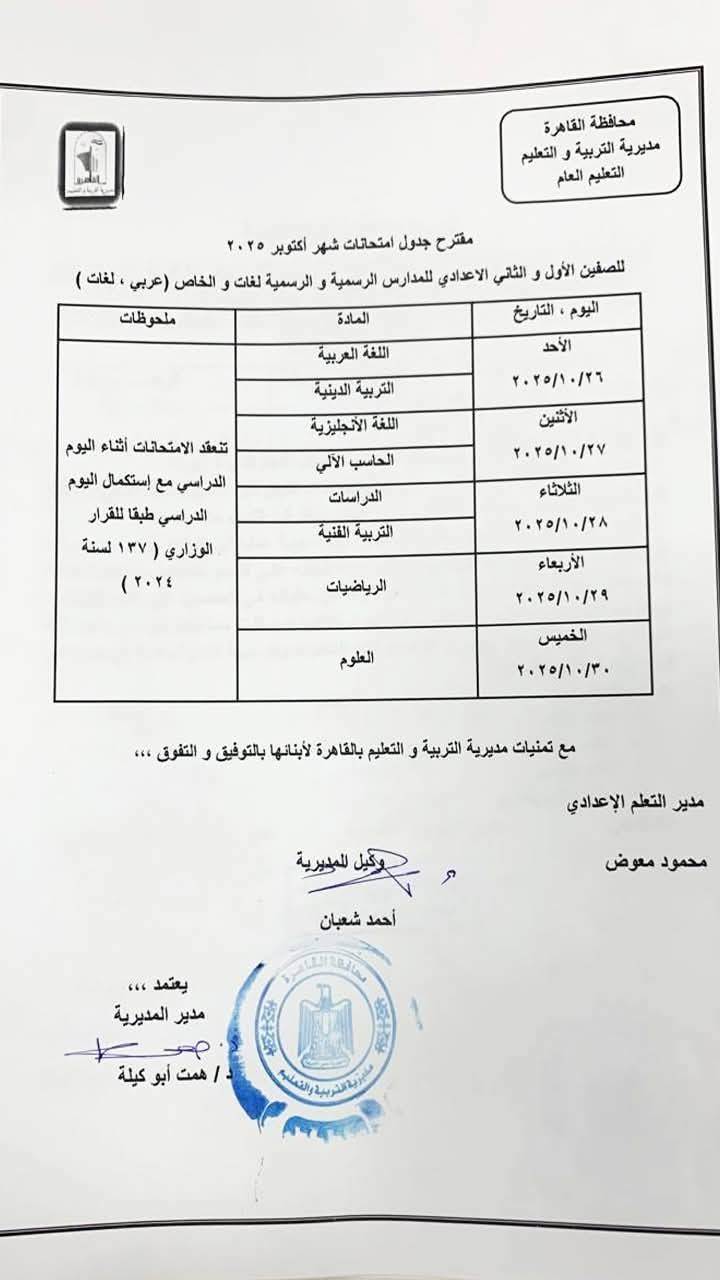 جدول امتحانات شهر أكتوبر للمرحلة الإعدادية 2025 القاهرة