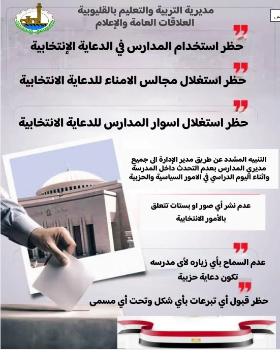 وتابعت المديرية، أن تم التأكيد على مديري الإدارات التعليمية بالتنبيه على مديري المدارس بعدم التحدث داخل المدرسة وأثناء اليوم الدراسي في الأمور السياسية والحزبية، بالإضافة إلى عدم نشر أي صور أو بوستات تتعلق بالأمور الانتخابية، وكذلك عدم السماح بأي زيارة لأي مدرسة في مضمونها دعاية حزبية أو انتخابية، وأيضا حظر قبول التبرعات بأي شكل وتحت أي مسمى.