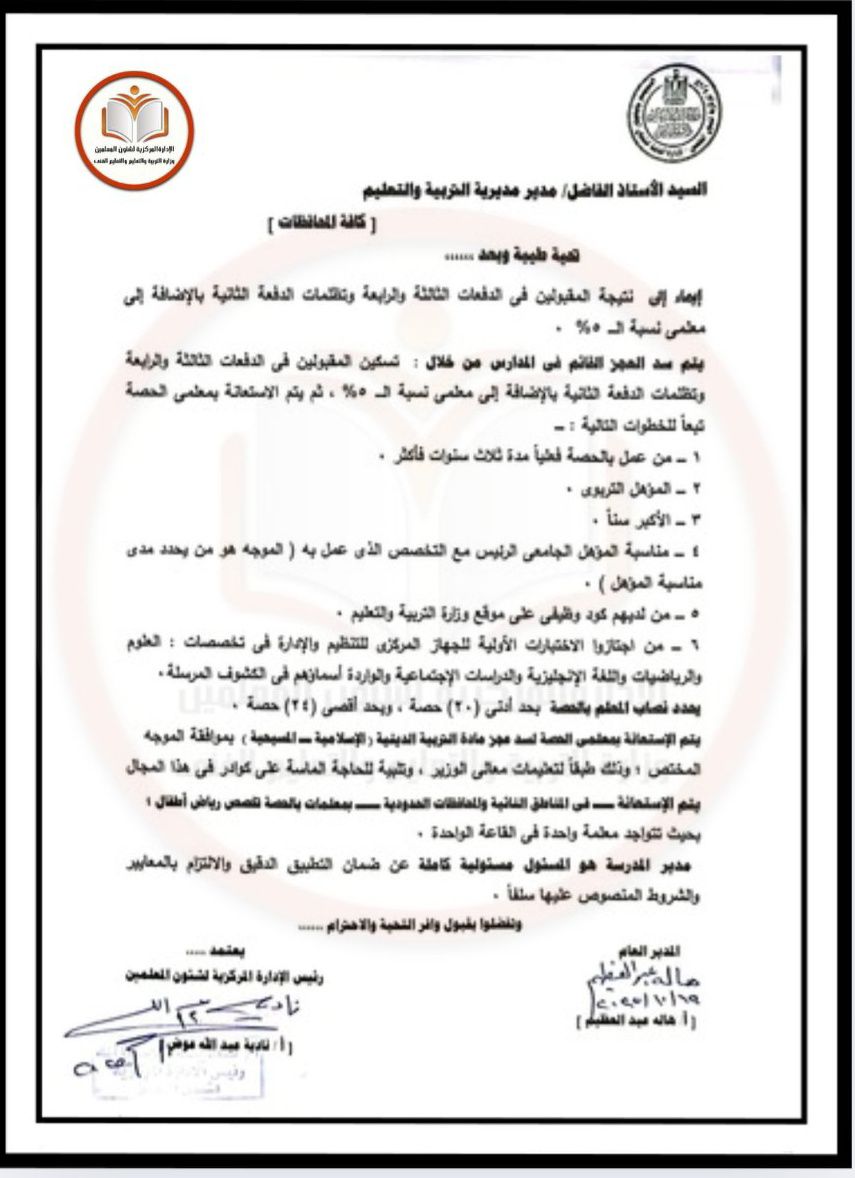 - يتم الإستعانة بمعلمى الحصة لسد عجز مادة التربية الدينية ( الإسلامية – المسيحية ) بموافقة الموجه المختص، وذلك طبقًا لتعليمات معالي الوزير، وتلبية للحاجة الماسة على كوادر في هذا المجال.