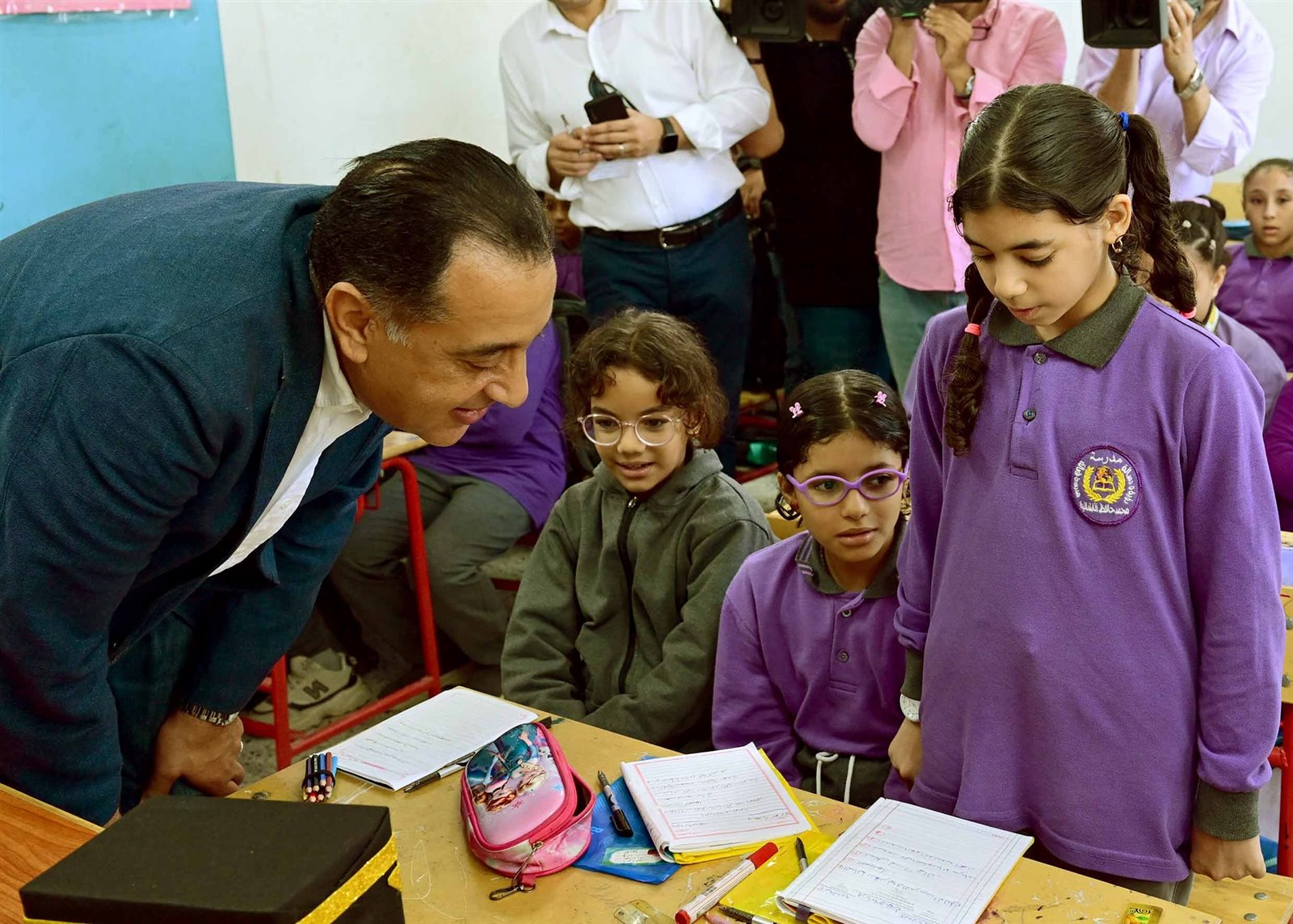 وقام الدكتور مصطفى مدبولي أيضًا بتفقد فصول المرحلة الابتدائية، واطمأن على كثافة الفصل، ونسبة الحضور، كما حرص على إجراء حوارات ودية مع الطلاب حول المواد التعليمية التي تُقدم لهم للتأكد من استيعابهم لها، كما تأكد من استلام هؤلاء الطلاب الكتب الدراسية.