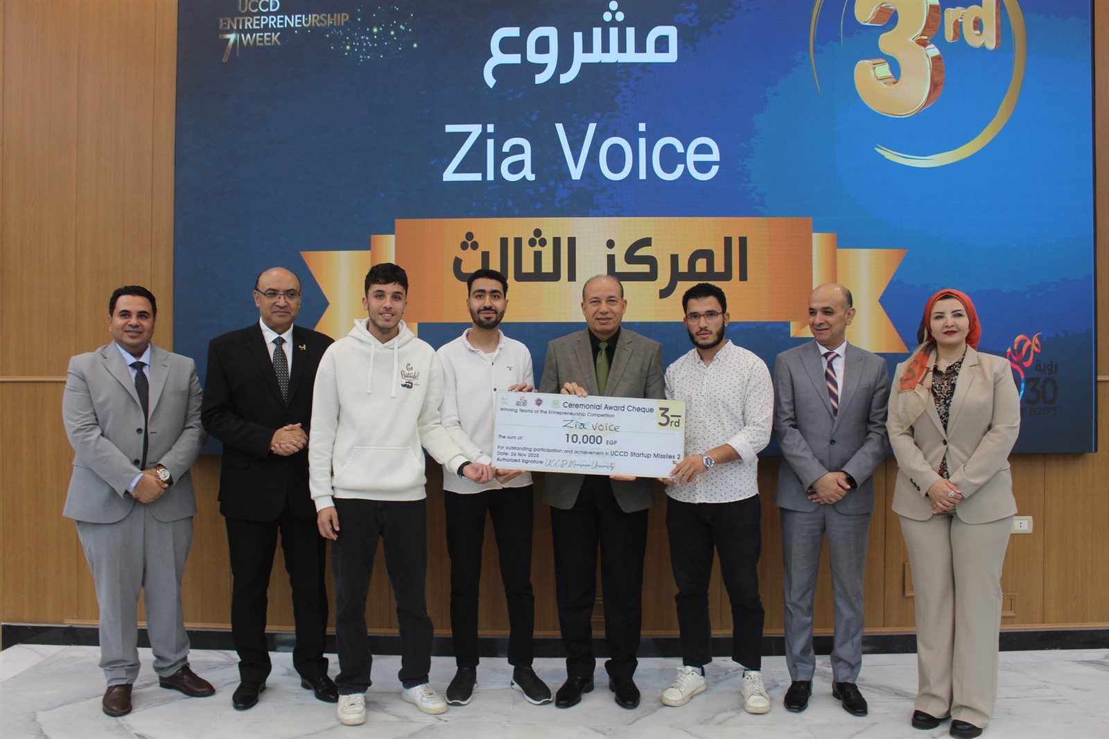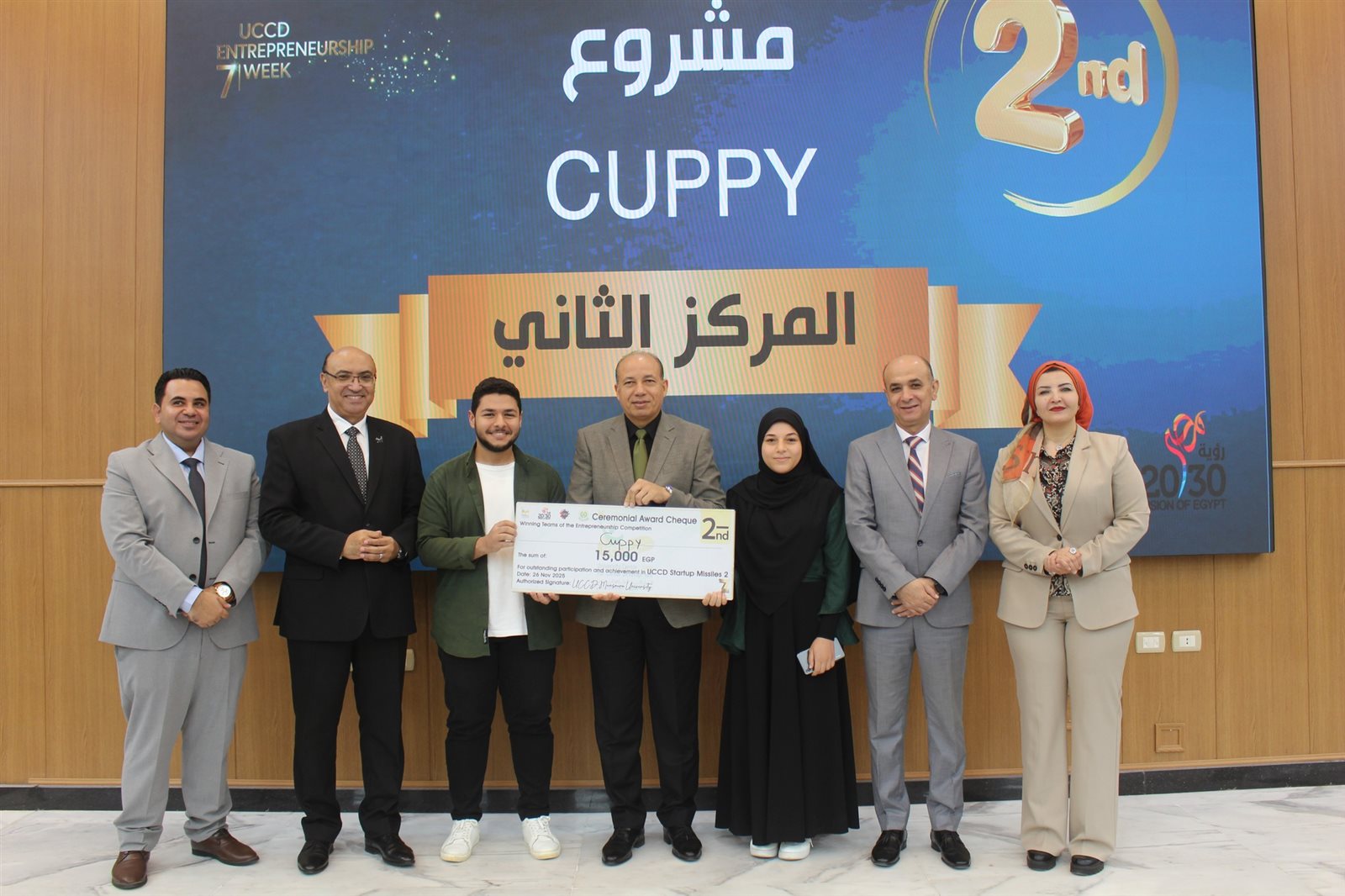 وفي ختام الجلسة الافتتاحية، قامت إدارة مراكز التطوير المهني بتكريم الدكتور شريف خاطر، رئيس الجامعة، اعتزازًا وتقديرًا لدعم العمل بالمراكز الجامعية للتطوير المهني، وجهوده المستمرة في تعزيز ثقافة ريادة الأعمال والابتكار بين الطلاب، والمساهمة الفاعلة في تمكين الشباب وربطهم بسوق العمل، كما قام رئيس الجامعة بتكريم الدكتور محمد عطية البيومي، نائب رئيس الجامعة لشؤون التعليم والطلاب، والدكتور طارق غلوش، نائب رئيس الجامعة لشؤون الدراسات العليا والبحوث، كما تم تكريم رعاة الحدث، إلى جانب تكريم الفرق الفائزة في مسابقة Startup Missiles بدورتها الثانية، حيث حصل فريق Aqua Guard على المركز الأول، وفريق Cuppy على المركز الثاني، وفريق Zai Voice على المركز الثالث.