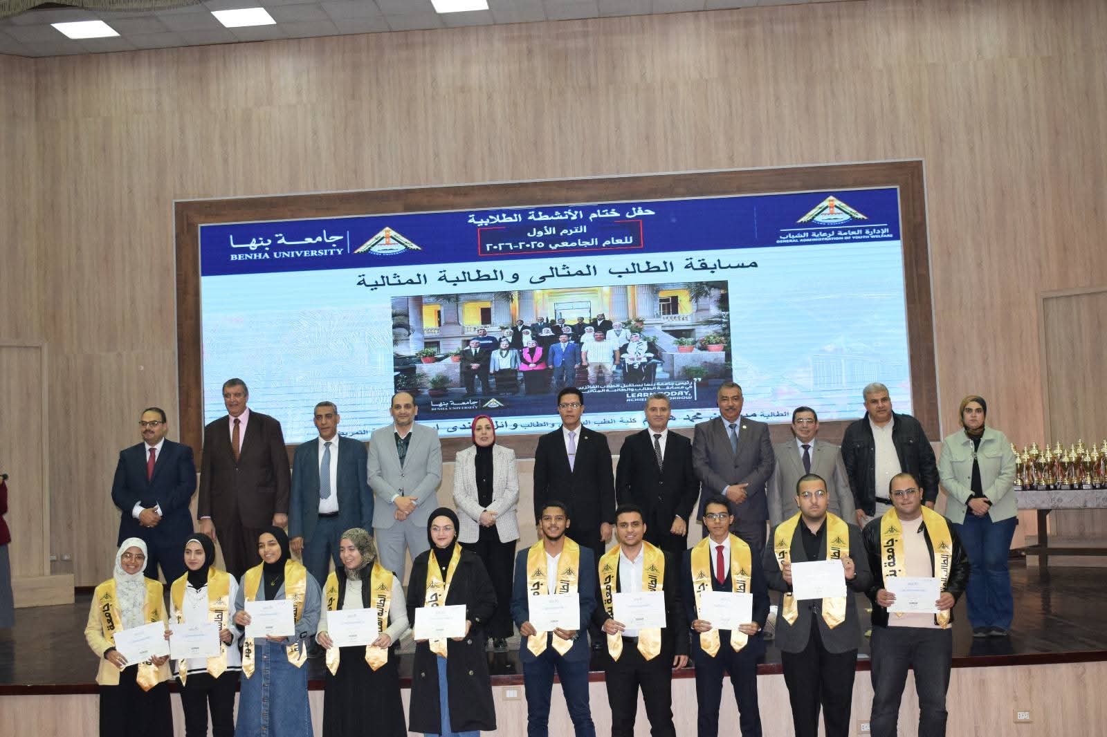 وفي نهاية الحفل كرم رئيس جامعة بنها، ومرافقوه عدد من الطلاب المتميزين بالمراكز الأولى في الأنشطة الطلابية منها النشاط الثقافي، ومسابقة القرآن الكريم ومسابقة الأحاديث النبوية، والإنشاد الديني، والمراسل التلفزيوني، والشعر والقصة القصيرة والمقال، والرواية، والدوري الثقافي، بالإضافة إلى تكريم الطلاب المتميزين في الأنشطة من ذوي الهمم.