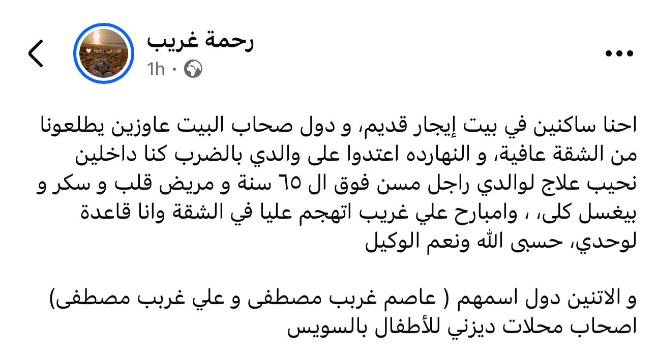 وقالت الفتاة عبر صفحتها الشخصية على موقع التواصل الاجتماعى مستعرضه فيديو لما تعرضت له ووالدها ، قائلة: احنا ساكنين في بيت إيجار قديم، و دول صحاب البيت عاوزين يطلعونا من الشقة عافية، و النهارده اعتدوا على والدي بالضرب كنا داخلين نحيب علاج لوالدي راجل مسن فوق ال ٦٥ سنة و مريض قلب و سكر و بيغسل كلى، ، وامبارح علي غريب اتهجم عليا في الشقة وانا قاعدة لوحدي، حسبى الله ونعم الوكيل.