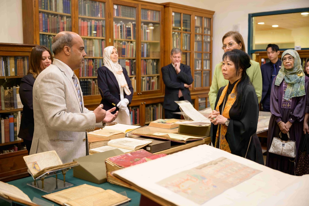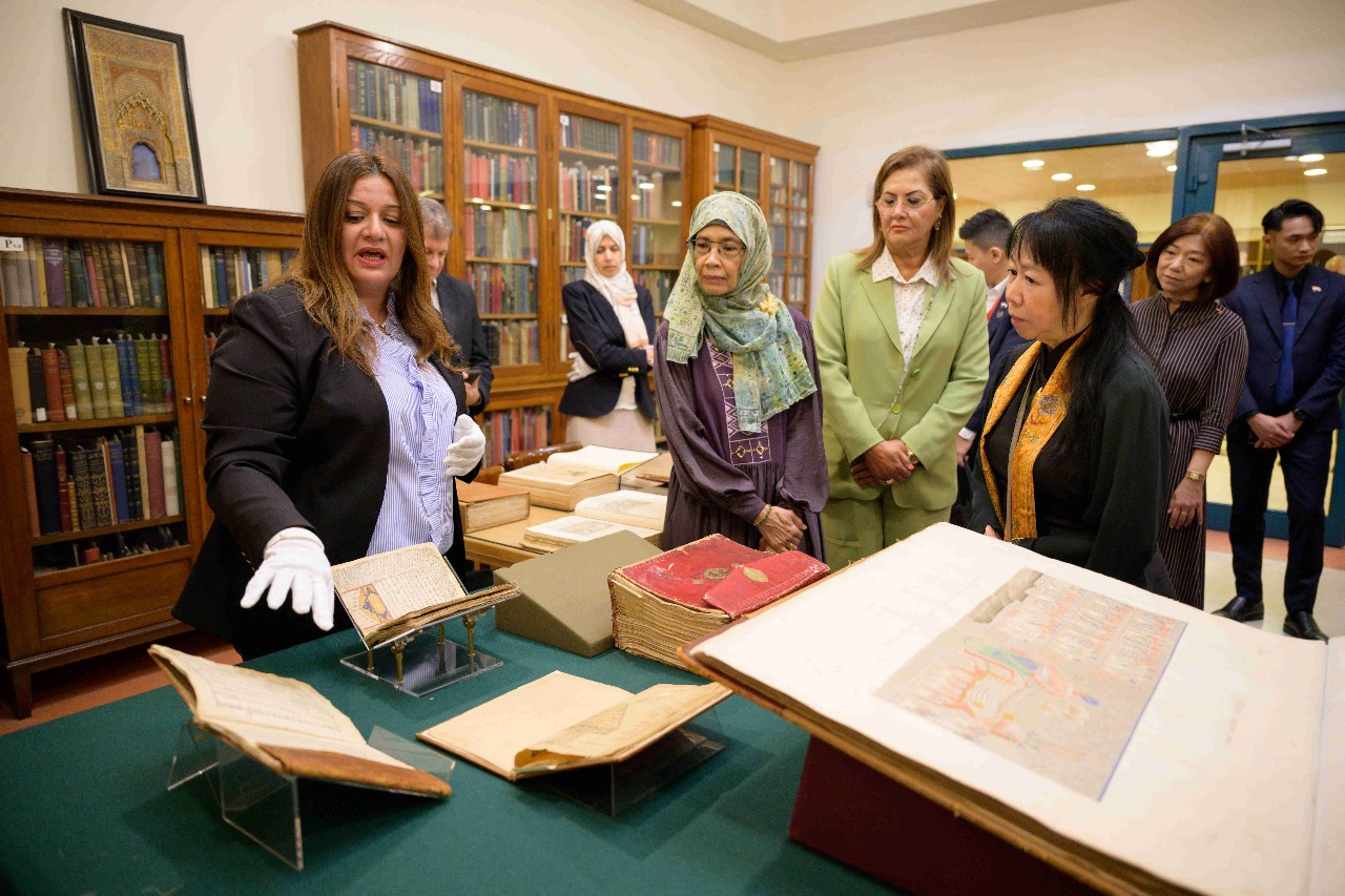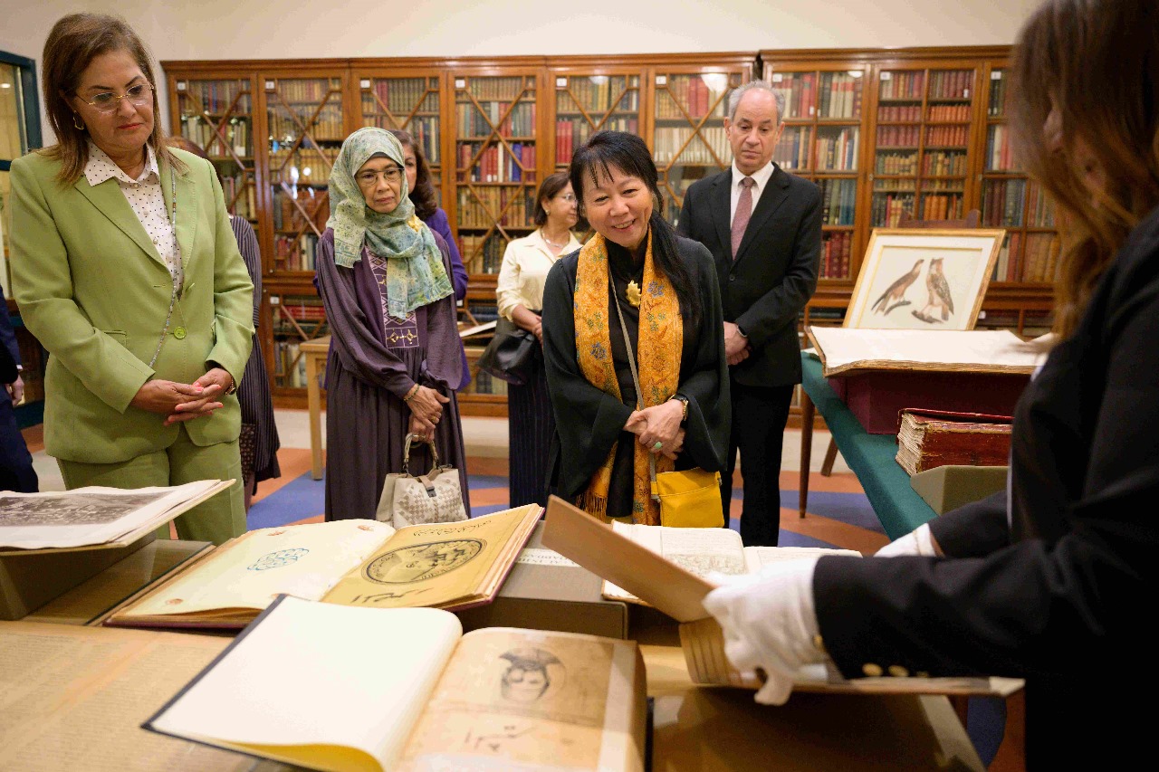 كما قام الوفد بجولة في قاعة كريزويل التي تضم مجموعة متميزة من المخطوطات العربية والكتب النادرة والمجلات التاريخية والخرائط والمواد الأرشيفية، حيث تعكس هذه المجموعات – التي توثّق الآثار والمواقع التاريخية في جميع أنحاء مصر – دور الجامعة الأمريكية بالقاهرة في احتضان المعرفة والتراث الثقافي، والحفاظ على الكنوز التي تخدم الأنشطة الأكاديمية والجمهور بصفة عامة.