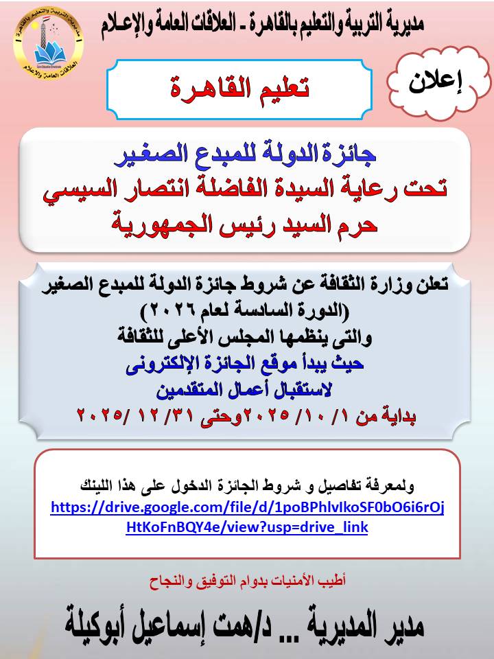 موعد التقدم للتسجيل بجائزة الدولة للمبدع الصغير الدورة السادسة لعام 2026
