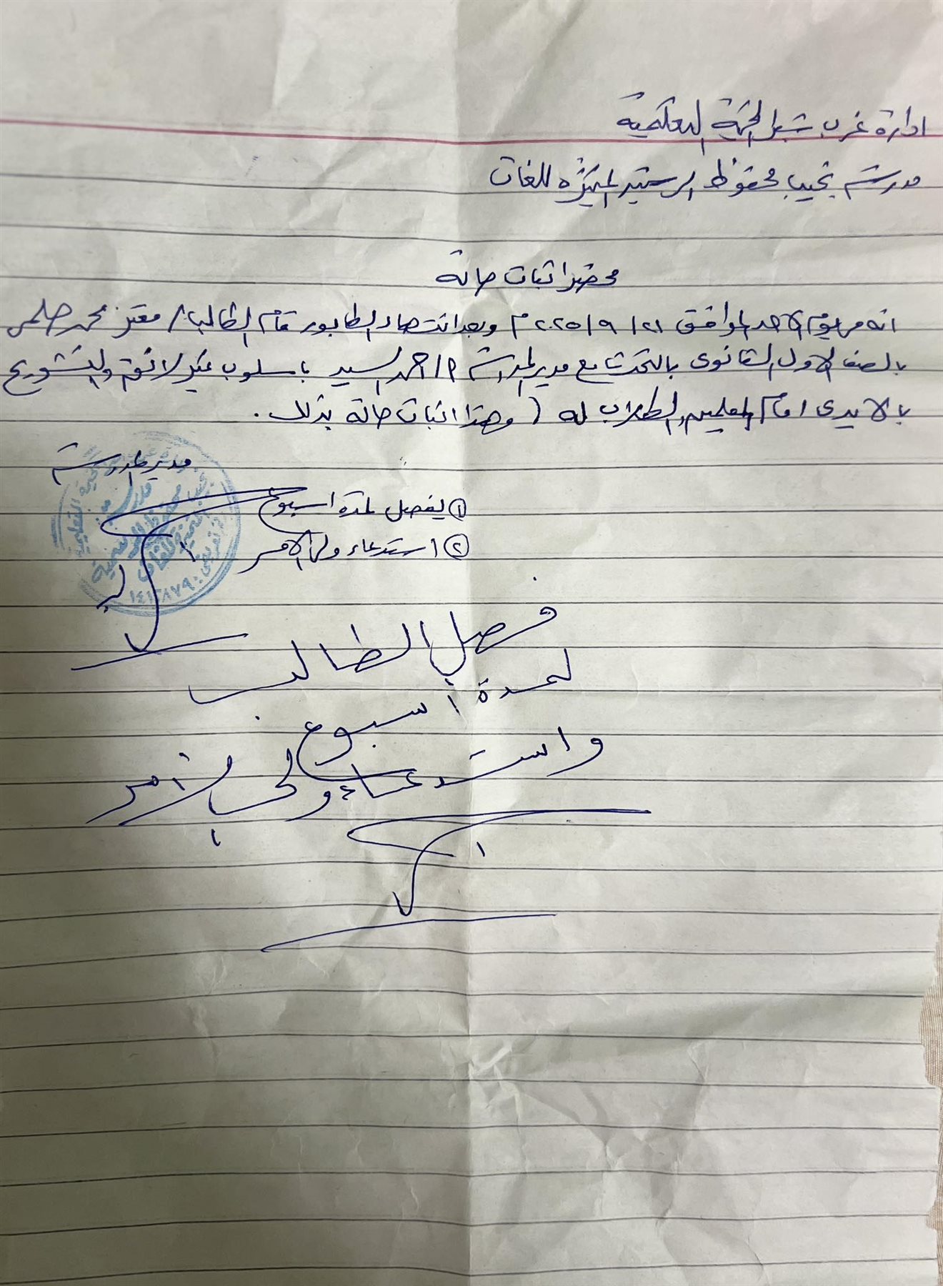 وجاء القرار عقب واقعة شهدها طابور الصباح، حيث حررت إدارة المدرسة محضر إثبات حالة يفيد بأن الطالب توجه إلى مدير المدرسة عقب انتهاء الطابور، وتحدث معه بألفاظ غير لائقة وأقدم على التلويح بيديه أمام المعلمين والطلاب، في سلوك اعتبرته الإدارة مخالفًا لقواعد الانضباط المدرسي، ما استدعى اتخاذ إجراء فوري بحقه.
