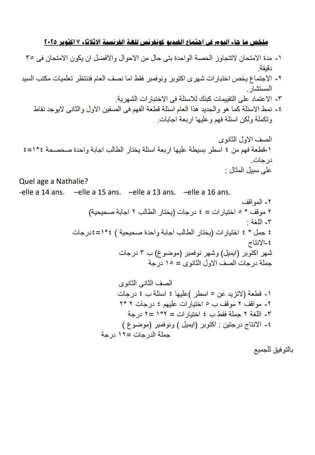 حددت وزارة التربية والتعليم والتعليم الفني، ضوابط امتحان شهر أكتوبر 2025 لمادة اللغة الفرنسية للصف الأول والثاني الثانوي، والتي تضمنت الآتي: