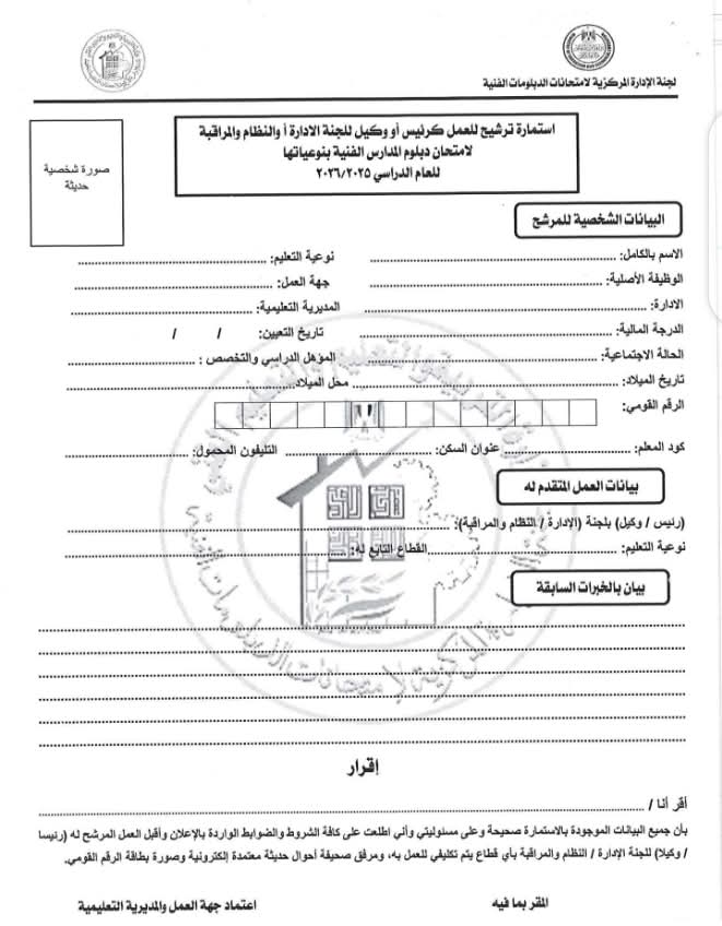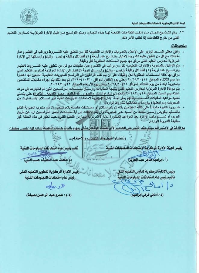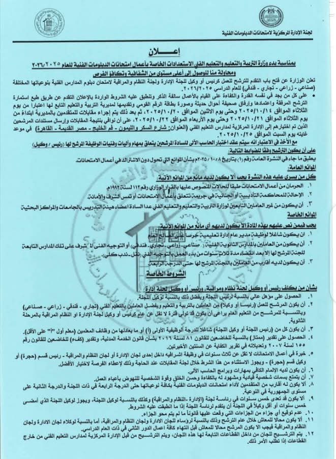 وحددت وزارة التعليم، شروط التقدم لوظائف رؤساء ووكلاء لجان الإدارة ولجان النظام والمراقبة لامتحانات الدبلومات الفنية 2025/2026: