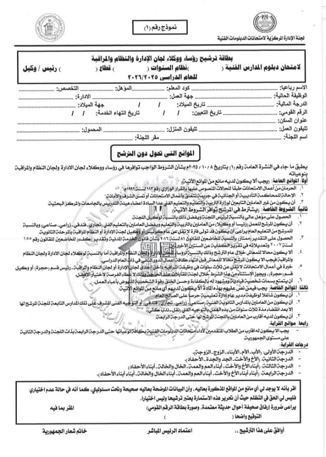 – أن يتمتع بسمات شخصية قيادية ومشهود له بالكفاءة وحسن الخلق وقوة الشخصية للنهوض بأعباء العمل. - ألا يكون له أقارب من المتقدمين لأداء امتحانات الدبلومات الفنية بكافة نوعياتها حتى الدرجة الرابعة في ذات اللجنة والدرجة الثانية على مستوى الجمهورية في النوعية.