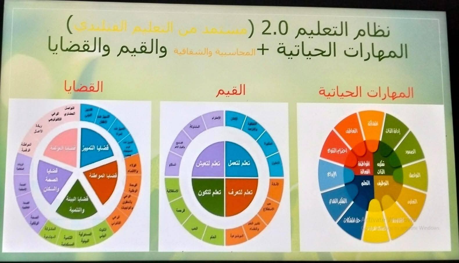 القيم والقضايا، تم التأكيد على أهمية غرس القيم الإيجابية لدى الطلاب، كاحترام الآخر، والمواطنة، والانتماء، والتسامح، إلى جانب تناول القضايا المعاصرة التي تؤثر على المجتمع، مثل ( التغير المناخي – الأمن الرقمي  – الاستدامة البيئية  – تعزيز ثقافة السلام ونبذ العنف )