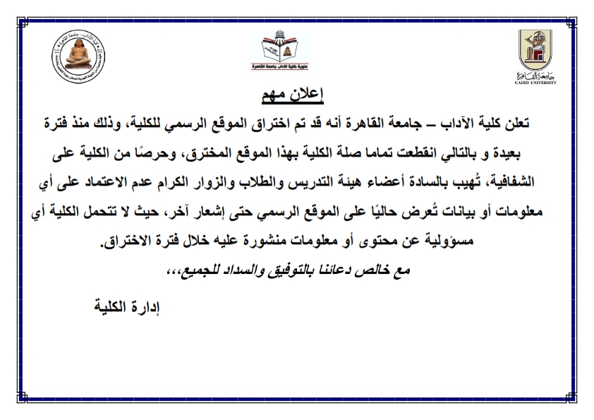 وحرصا من كلية الآداب جامعة القاهرة على الشفافية، تُهيب بأعضاء هيئة التدريس والطلاب والزوار الكرام عدم الاعتماد على أي معلومات أو بيانات تُعرض حاليا على الموقع الرسمي حتى إشعار آخر، حيث لا تتحمل كلية الآداب جامعة القاهرة أي مسؤولية عن محتوى أو معلومات منشورة عليه خلال فترة الاختراق.