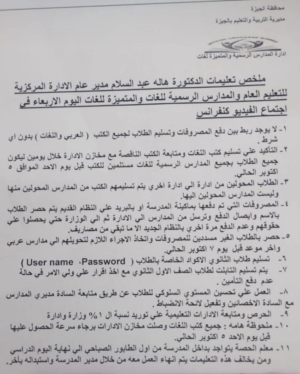 - التأكيد علي تسليم كتب اللغات ومتابعة الكتب الناقصة مع مخازن الإدارة خلال يومين ليكون جميع الطلاب بجميع المدارس الرسمية للغات مستلمين للكتب قبل يوم الأحد الموافق 5 اكتوبر الحالي.