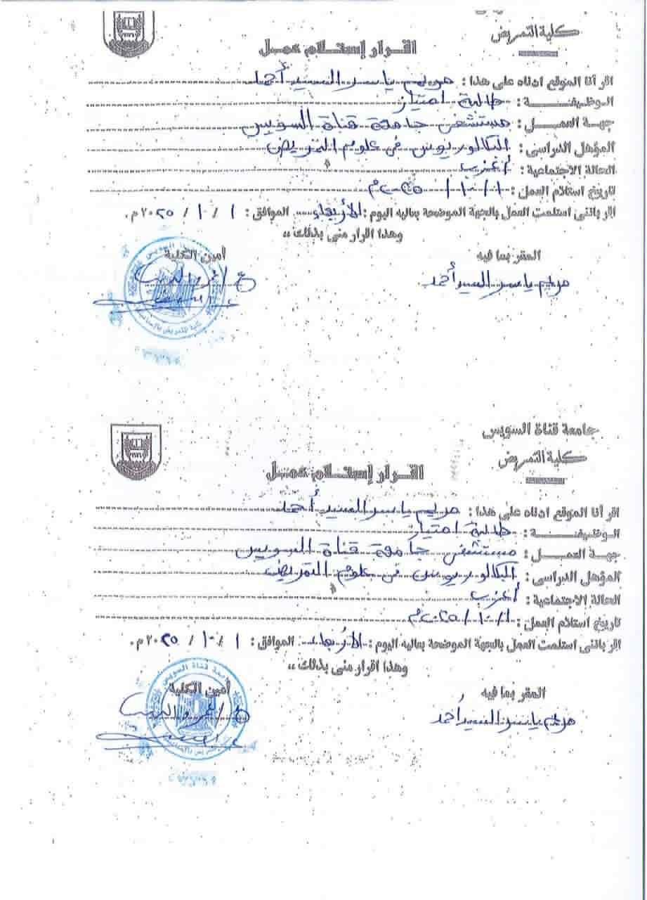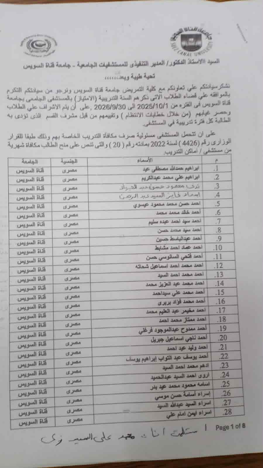 من جانبه، نشرت مريم ياسر الطالبة في الفرقة الرابعة بكلية التمريض جامعة قناة السويس على موقع التواصل الاجتماعي فيسبوك: السلام عليكم أنا الطالبة: مريم ياسر السيد طالبة بكلية التمريض جامعة قناة السويس الفرقة الرابعة وعلى مشارف بدء الامتياز إن شاء الله من الفتره 1/10/2025 حتى 30/9/2026 إن شاء الله