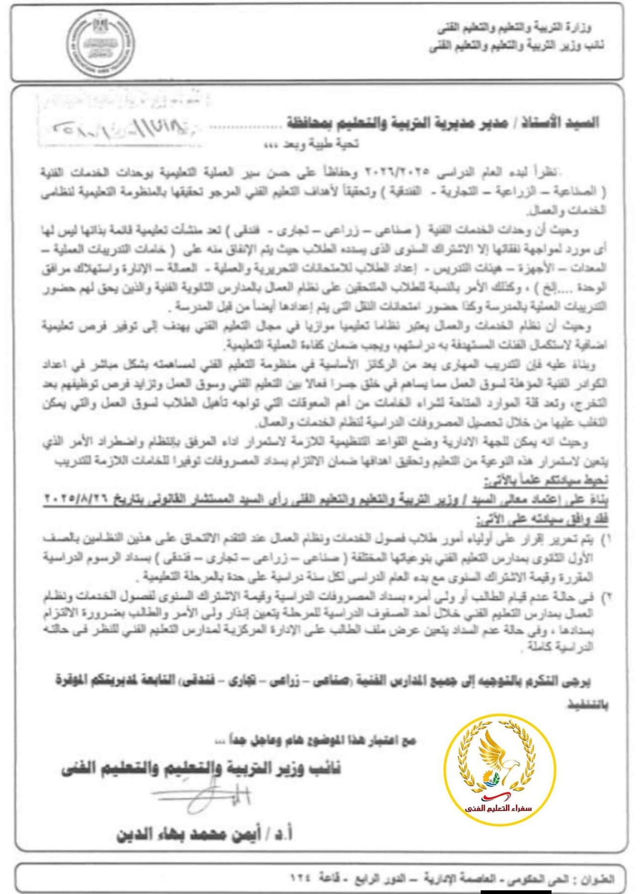 مصير طلاب التعليم الفني الخدمات غير مسددي الرسوم الدراسية 2026