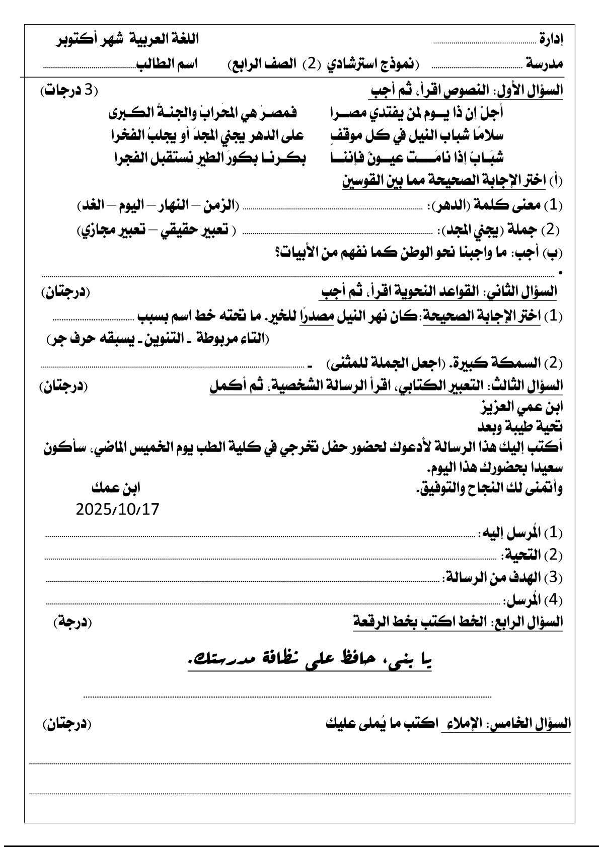 نماذج امتحانات شهر أكتوبر لغة عربية رابعة ابتدائي 2025 بالإجابات pdf