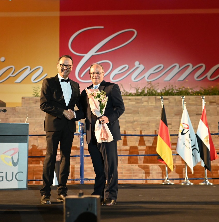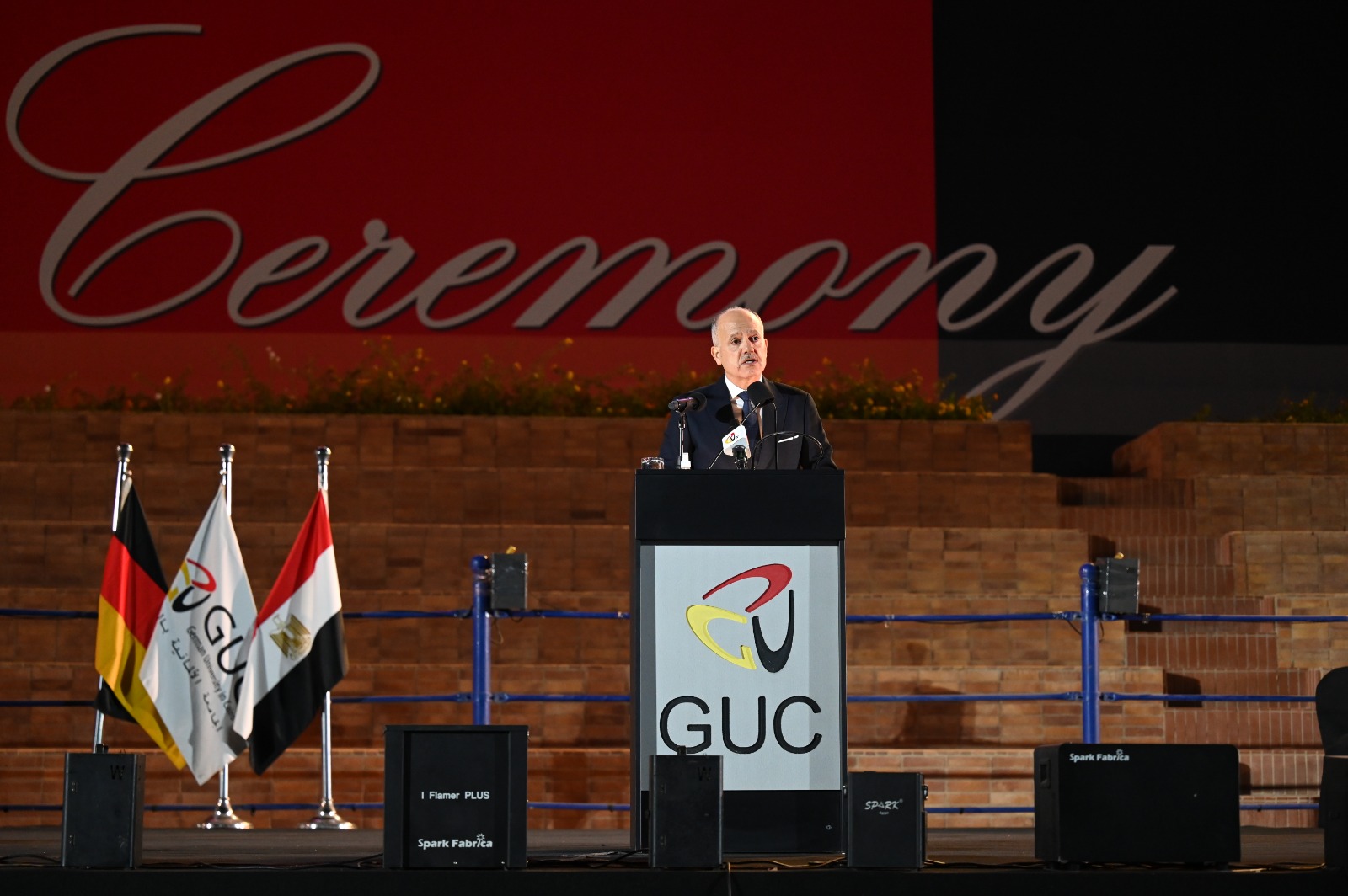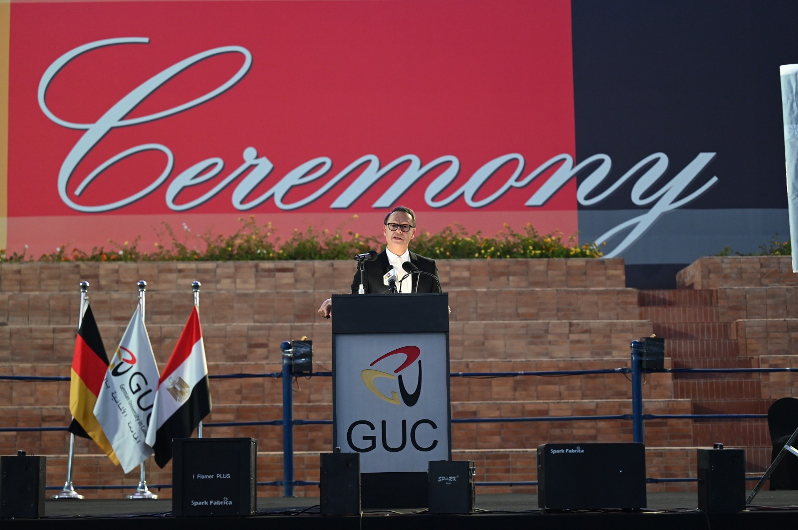 والقى رئيس مجلس أمناء الجامعة الألمانية بالقاهرة ورئيس مجلس أمناء الجامعة الألمانية الدولية، كلمة بهذه المناسبة مرحبًا بالحضور، مهنئًا أولياء أمور الخريجين، مقدمًا الأمتنان لشركاء النجاح من وزارة التعليم العالي المصرية ووزارة الخارجية المصرية والحكومة المصرية، والسفارة الألمانية بالقاهرة والهيئة الألمانية للتبادل العلمي DAAD ووزارة الخارجية الألمانية والوزارة الاتحادية للبحث والتكنولوجيا والفضاء BMFTR والجامعات المؤسسة وأعضاء البرلمان المصري والألماني، حيث تعاونت المؤسسات والوزارات والجامعات بتشكيل فريق عمل ضم مجموعة من الأفراد يتمتعون بمهارات تكاملية فيما بينهم سعوا لتحقيق هدف مشترك واضح ومحدد ونجحوا في التخطيط والتنفيذ لهً حتى أصبحت الجامعة الألمانية بالقاهرة أكبر جامعة ألمانية عابرة للحدود.