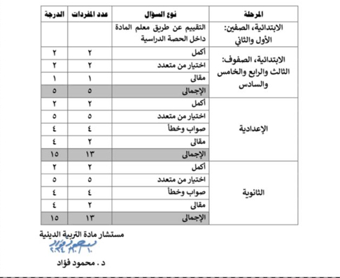 كما أكدت وزارة التربية والتعليم والتعليم الفني على الالتزام بما ورد في خطاب الإدارة المركزية للتعليم العام في 9 أكتوبر بشأن تنظيم أعمال الامتحانات والتقييم بمادة التربية الدينية لجميع المراحل التعليمية مع الالتزام بمواصفات الورقة الامتحانية والدرجات والمفردات التالية: