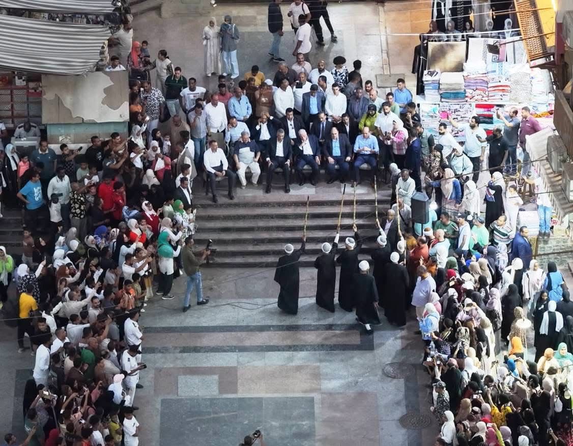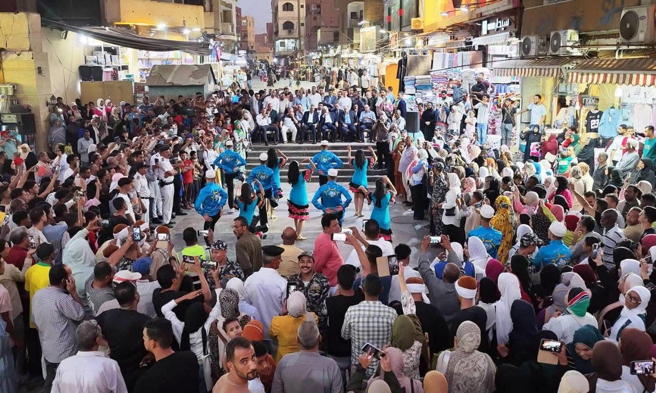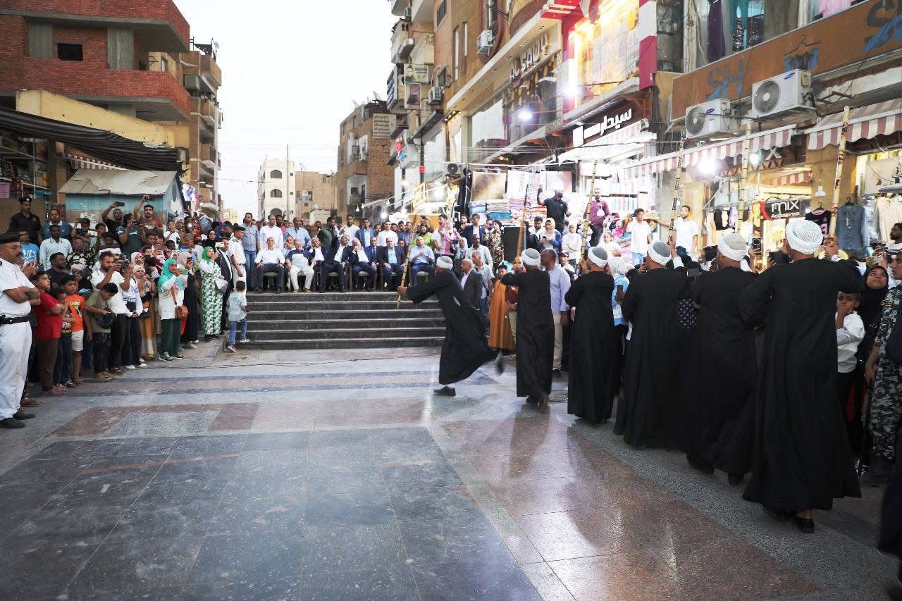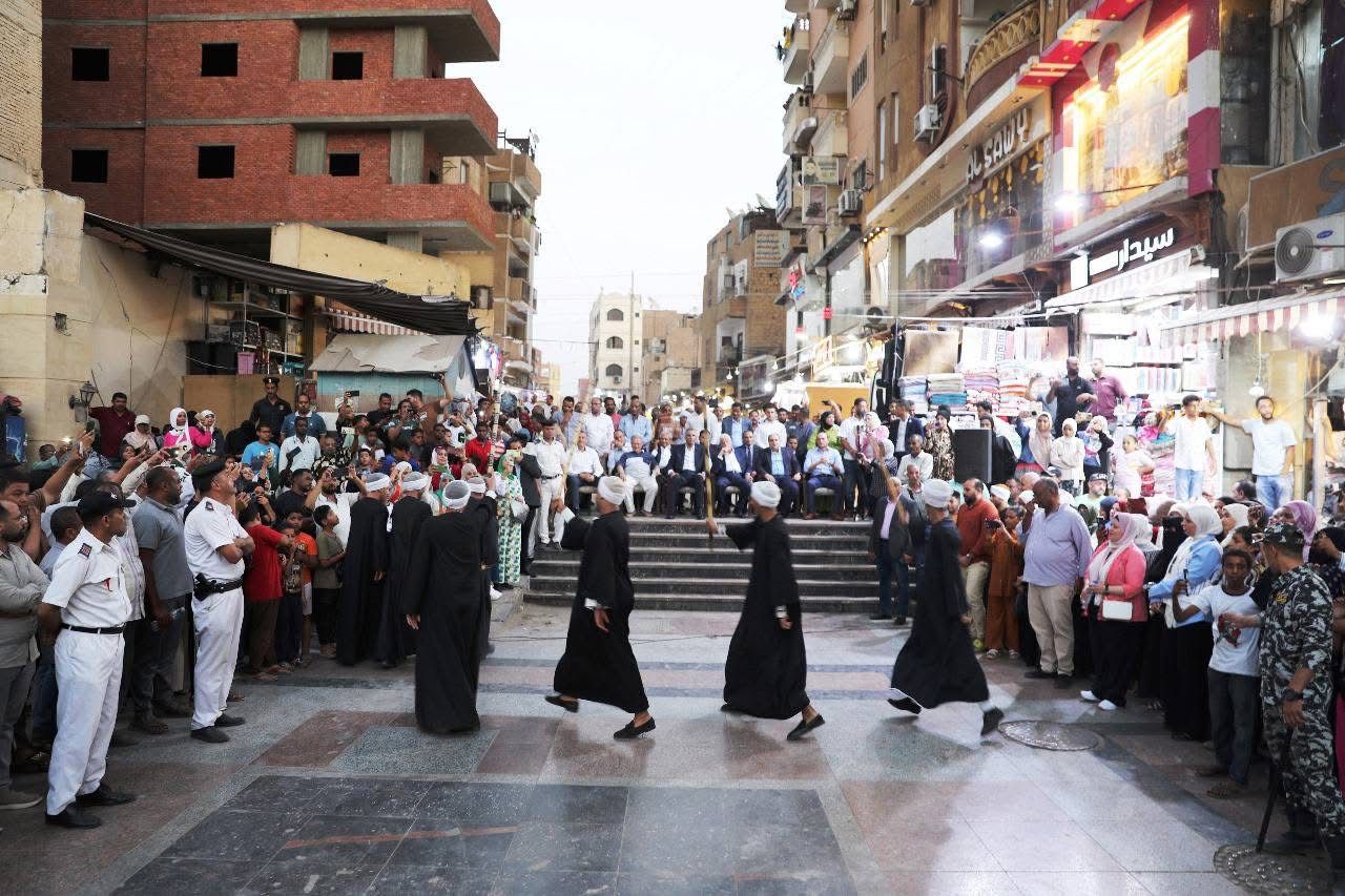 حيث رافقهما المهندس عمرو لاشين نائب المحافظ ، واللواء خالد اللبان رئيس الهيئة العامة لقصور الثقافة ، والمهندس حمدى سطوحى مدير عام صندوق التنمية الثقافية ، وسط لحظات مبهجة إمتلأت بالأغانى التراثية والرقصات الشعبية التى جسدت روح مصر عبر العصور قدمتها 8 فرق للفنون الشعبية .