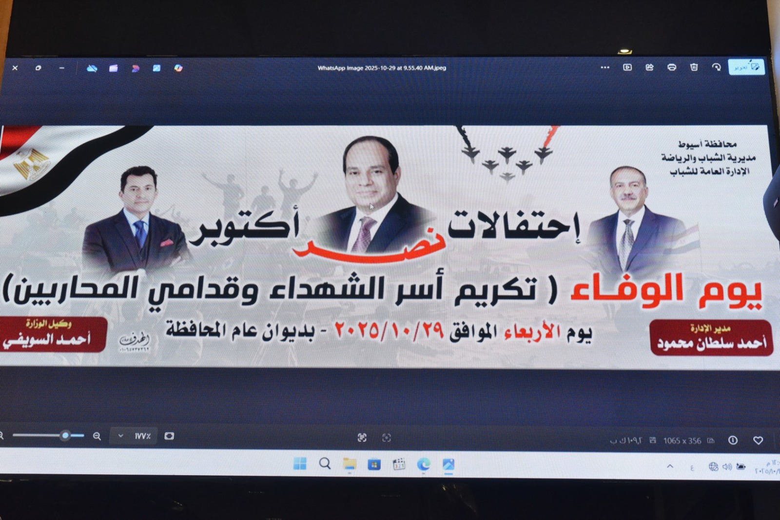 شهد اللواء دكتور هشام أبو النصر محافظ أسيوط، احتفالية “يوم الوفاء” التي نظمتها مديرية الشباب والرياضة بمناسبة الذكرى الـ52 لانتصارات أكتوبر المجيدة، لتكريم أسر الشهداء وقدامى المحاربين، وذلك بقاعة الاجتماعات الكبرى بديوان عام المحافظة، وسط أجواء وطنية مفعمة بالفخر والاعتزاز.