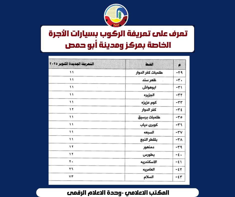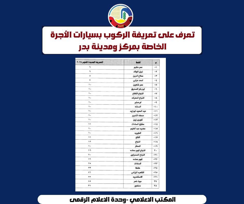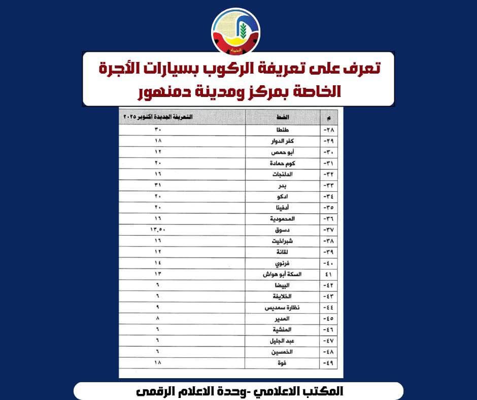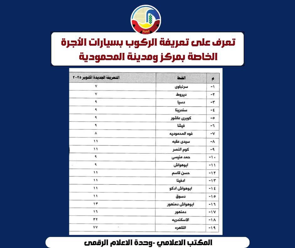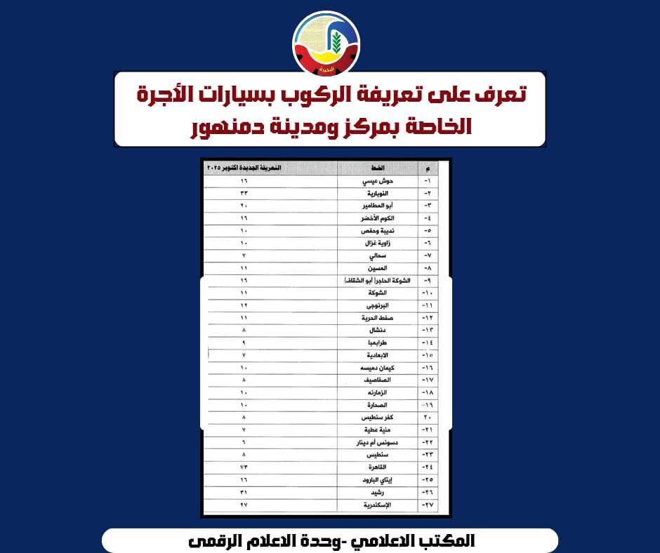 ٱعتمدت الدكتورة جاكلين عازر – محافظ البحيرة، التعريفة الجديدة لركوب سيارات الأجرة والسرفيس والنقل العام والتاكسي والتوك توك، وذلك عقب قرار لجنة تسعير المنتجات البترولية بزيادة أسعار المواد البترولية صباح اليوم.