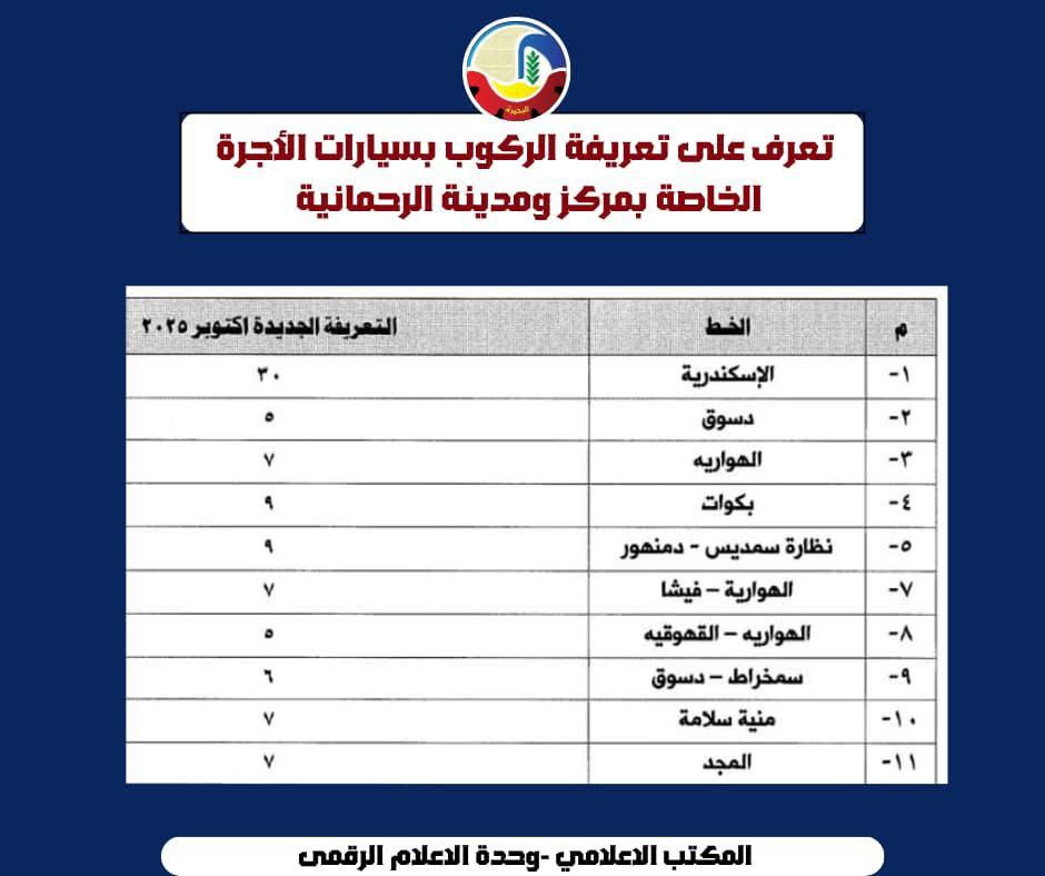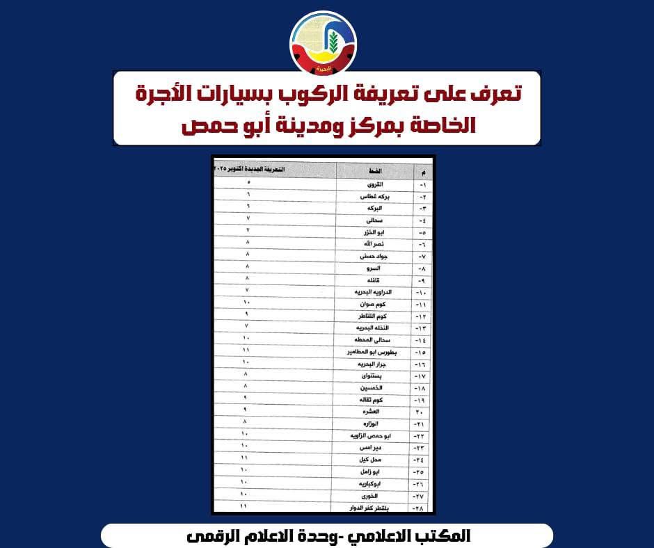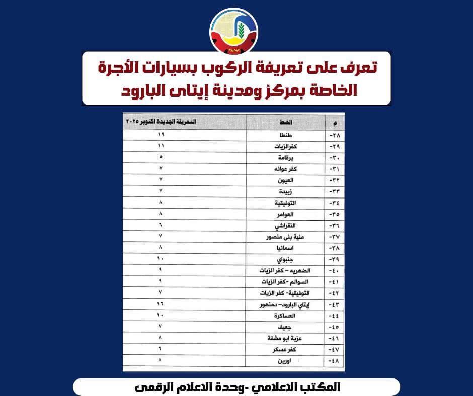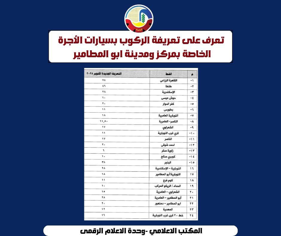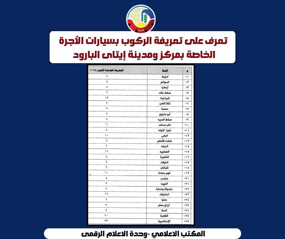 كما كلفت المحافظ إدارة مرور البحيرة ومباحث المرور وإدارة مشروع المواقف، بالتنسيق مع مشروعي النقل الداخلي والسياحة بالمحافظة، بالإستعانة والدفع بعدد من مركبات المشروع حال حدوث أي تداعيات من سائقي السيارات والمركبات المشمولة بالتعريفة الجديدة.