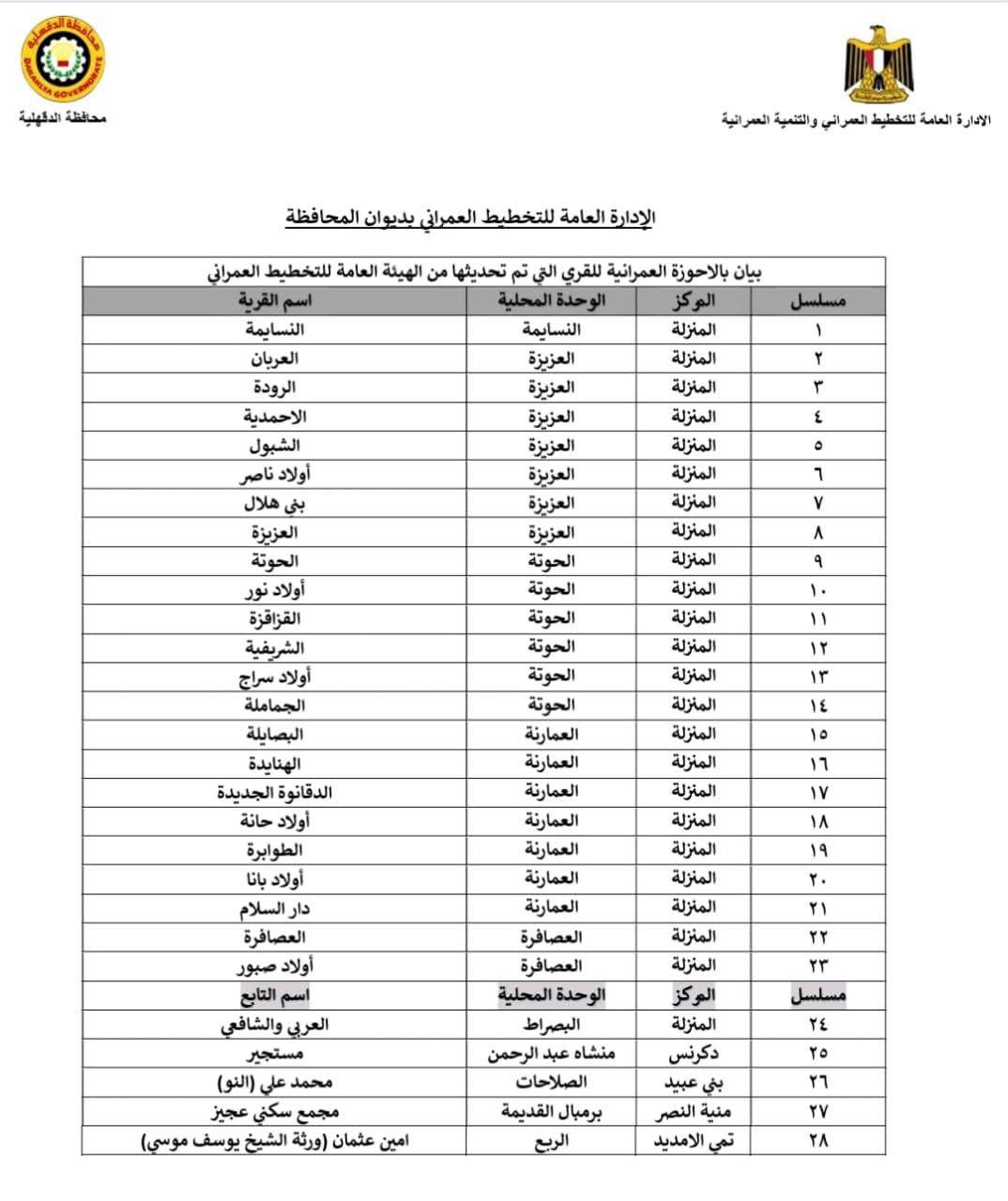 أعلن اللواء طارق مرزوق محافظ الدقهلية، عن اعتماد الأحوزة العمرانية لـ 28 قرية وعزبة، في عدد من المراكز، شملت 23 قرية بمركزي المنزلة والمطرية، 5 عزب بمراكز المنزلة، دكرنس، بني عبيد، منية النصر، تمي الامديد، ويؤكد على الإنتهاء من الأحوزة العمرانية تباعا على مستوى مراكز المحافظة، حرصا على مصالح المواطنين، وذلك بالتعاون والتنسيق مع الهيئة العامة للتخطيط العمراني بوزارة الإسكان، ودعم وزارة التنمية المحلية، وفي إطار توجيهات فخامة الرئيس عبد الفتاح السيسي رئيس الجمهورية.