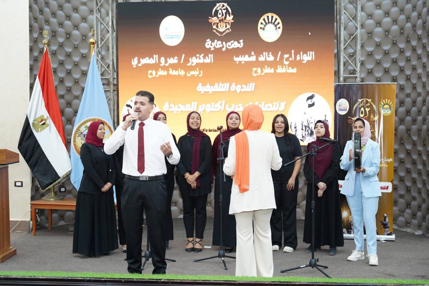 وفقرات غنائية لكورال مديرية الشباب والرياضة وعرض فيديو عن انتصارات السادس من أكتوبر أعدته الإدارة العامة للعلاقات العامة والإعلام بمحافظة مطروح  .