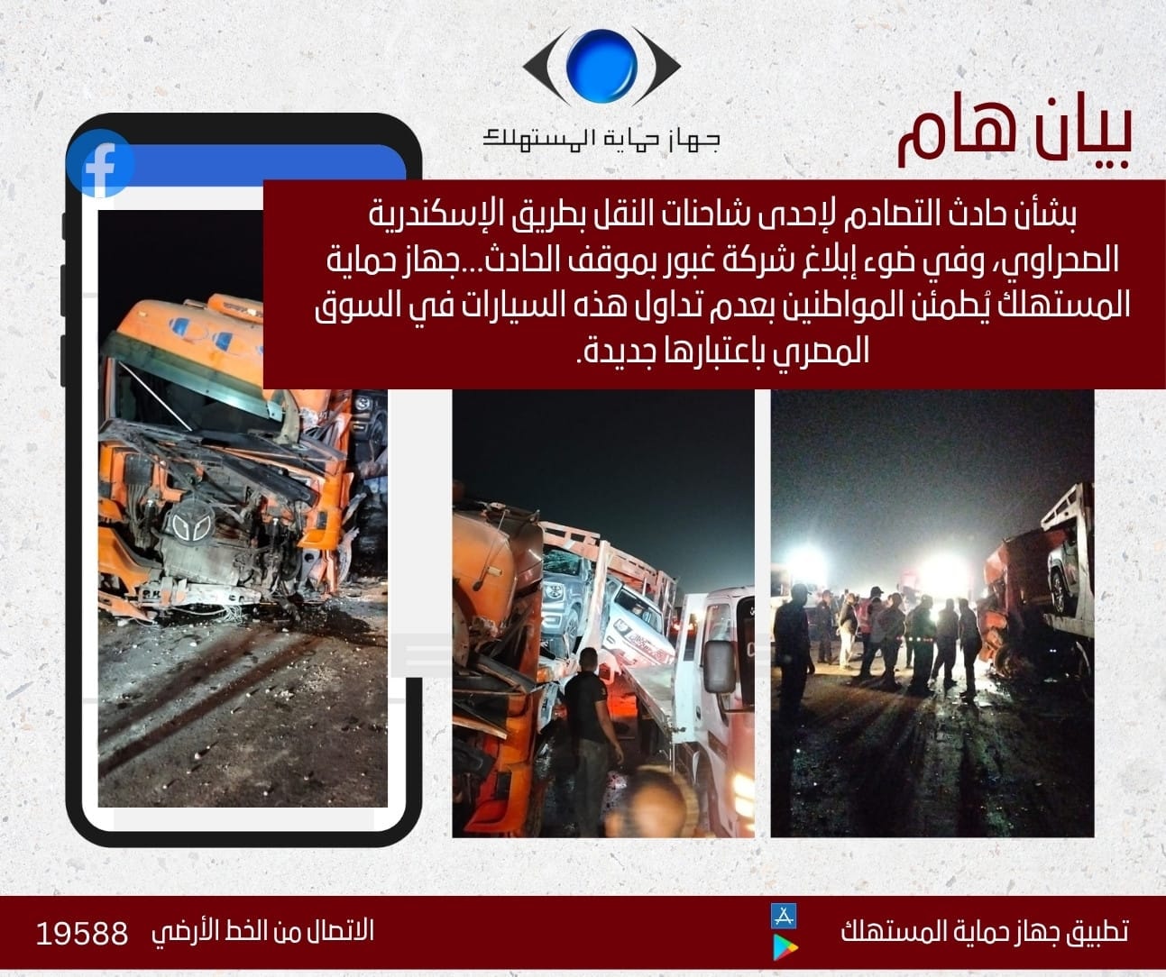 أعلن جهاز حماية المستهلك أنه تابع باهتمام بالغ حادث التصادم الذي وقع فجر يوم الأربعاء الماضي بطريق الإسكندرية الصحراوي، حيث اصطدمت إحدى شاحنات النقل المحمّلة بسيارات من طراز “هافال H7-HEV” موديل 2026.