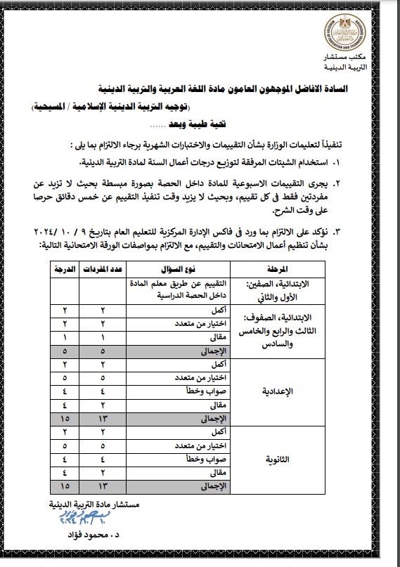 ووجهت الوزارة بضرورة إجراء التقييمات الأسبوعية لمادة التربية الدينية داخل الحصة بصورة مبسطة بحيث لا تزيد عن مفردتين فقط في كل تقييم، وبحيث لا يزيد وقت تنفيذ التقييم عن خمس دقائق حرصا على وقت الشرح.