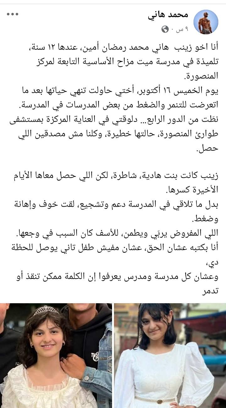 كشف شقيق الطالبة زينب هاني محمد رمضان بمدرسة ميت مزاج الأساسية التابعة لمركز المنصورة، أن شقيقته حاولت إنهاء حياته والانتحار بالقفز من الدور الرابع بسبب تنمر إحدى المعلمات عليها.