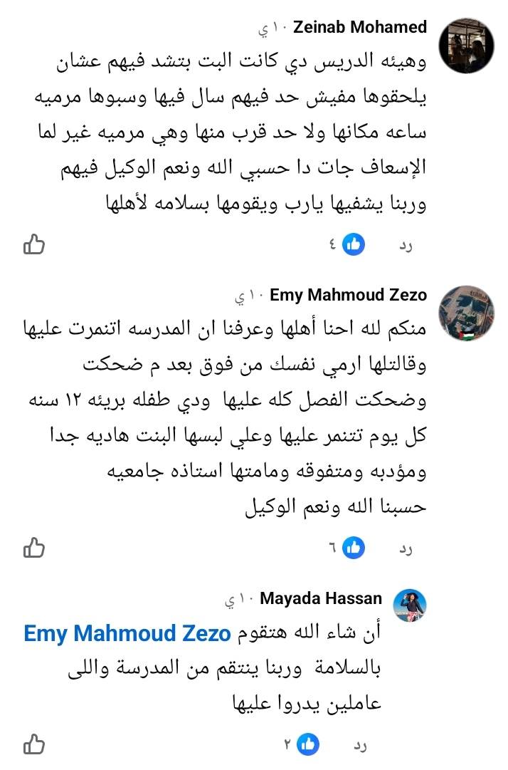 وعلقت إحدى أقارب الطفلة زينب على منشور شقيقها، بقولها: ” نحن أهلهان وعرفنا أن المعلمة تنمرت عليها وقالت لها ارمي نفسك من فوق بعدما ضحكت عليها مع زملائها بالفصل”.