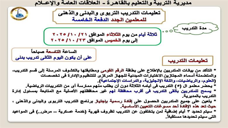وأوضحت مديرية التعليم بعض تعليمات التدريب ومنها، التأكد من بيانات المتدربين بالإطلاع على بطاقة الرقم القومى ومطابقتها بالكشوف المرسلة إلى قسم التدريب، والمتضمنة أسماء المجتازين الاختبارات المبدئية للجهاز المركزى للتنظيم والإدارة فى تخصصات العلوم، والرياضيات، واللغة الإنجليزية، والدراسات الإجتماعية.