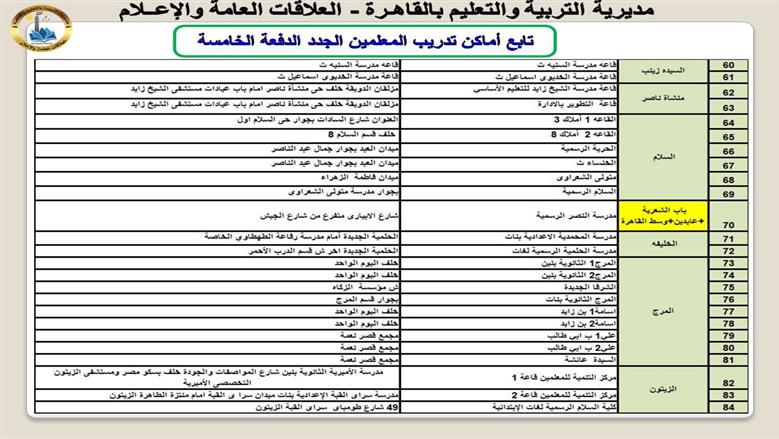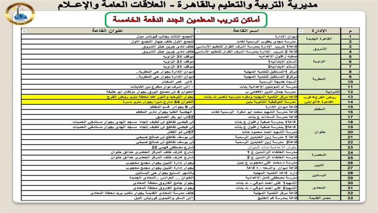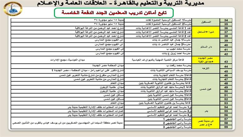 أماكن تدريب المعلمين الجدد بالقاهرة ضمن الدفعة الخامسة من مسابقة 30 ألف معلم