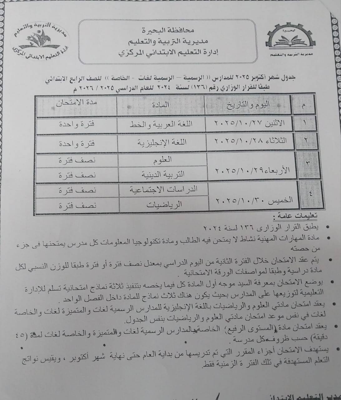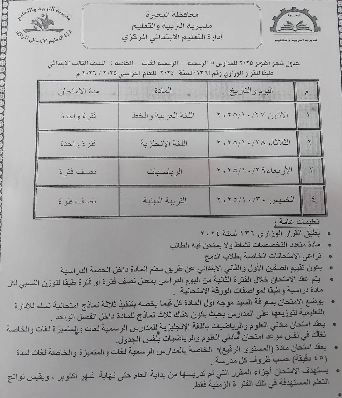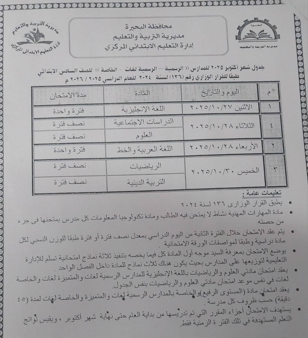 أعلنت مديرية التربية والتعليم بمحافظة البحيرة، جداول امتحانات شهر أكتوبر لصفوف النقل بمراحل التعليم الثلاثة “الابتدائية والإعدادية والثانوية”، للعام الدراسي 2025-2026.